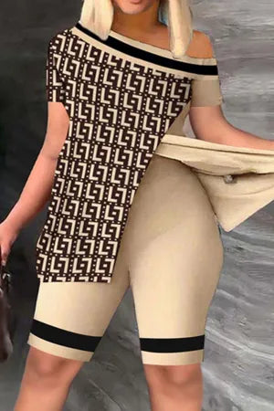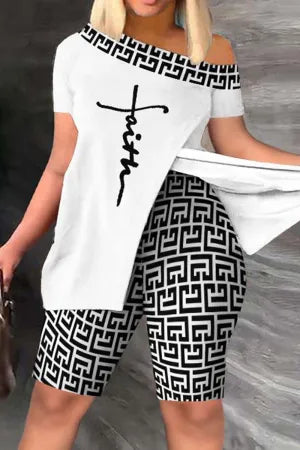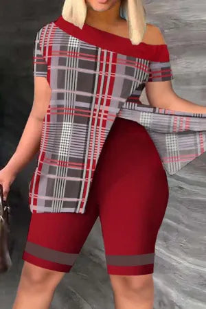 2 Peças conjuntas estampa casual patchwork fenda gola oblíqua