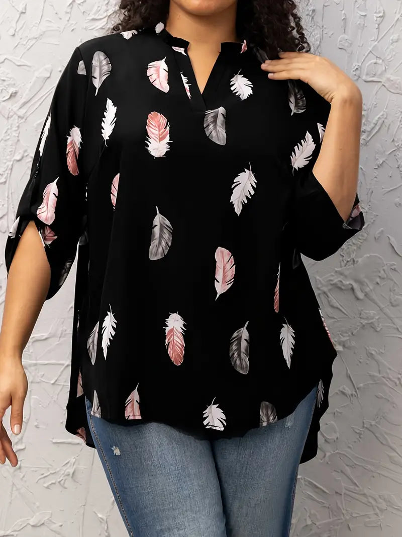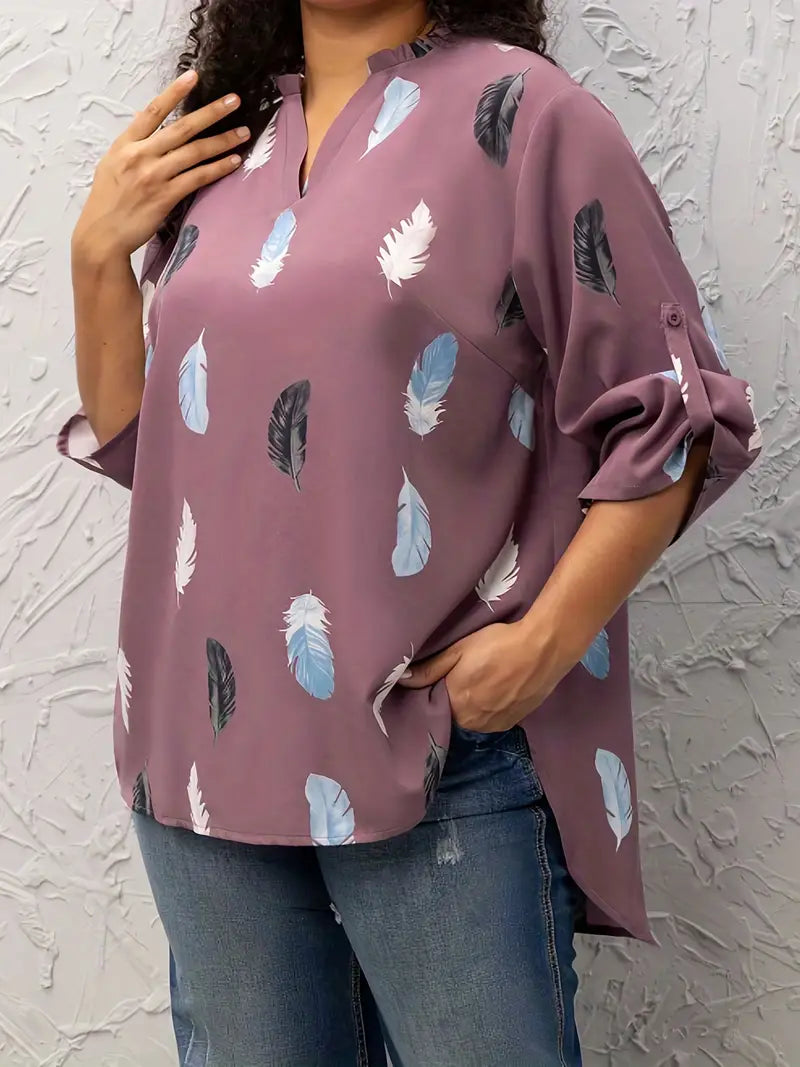 Blusa casual tamanho grande, blusa feminina com estampa de penas, manga comprida