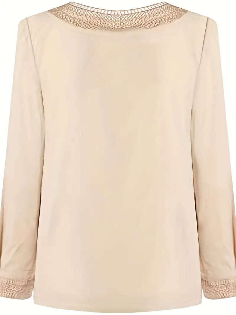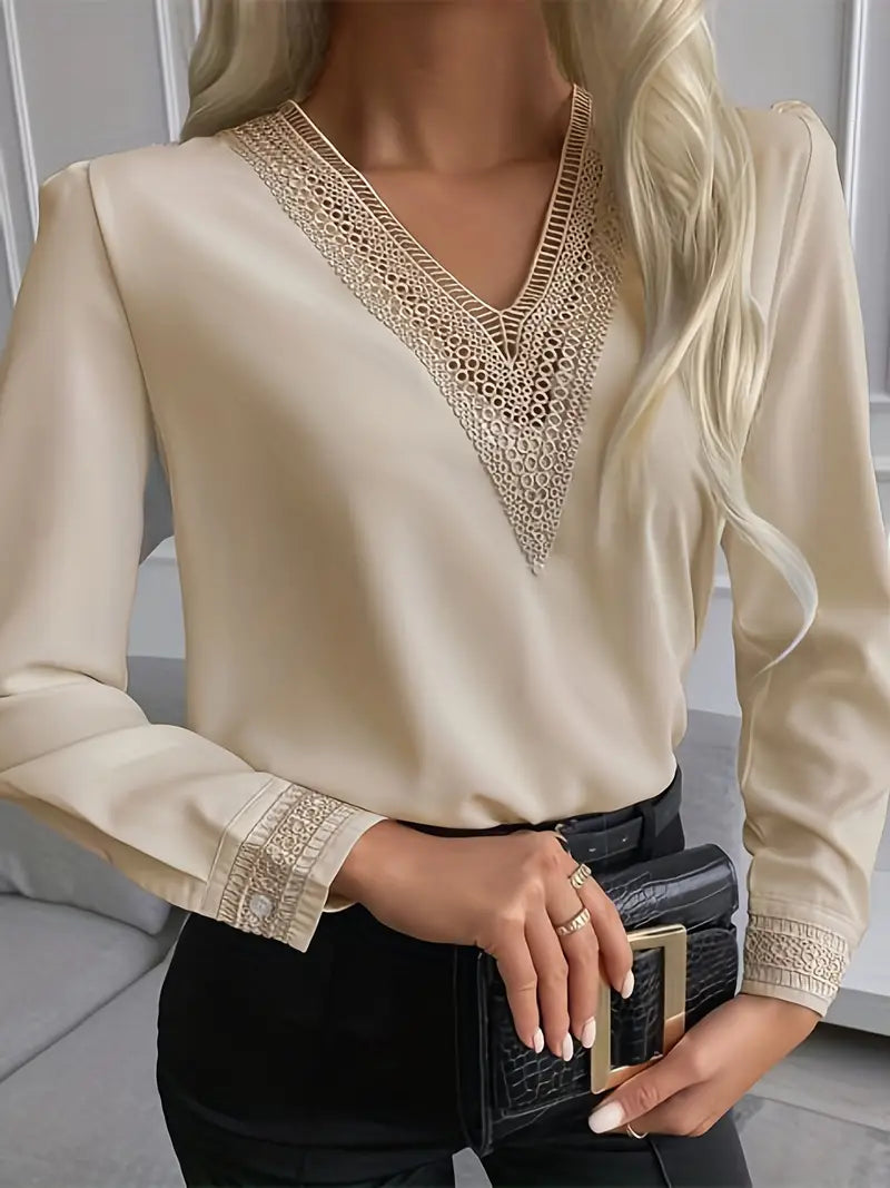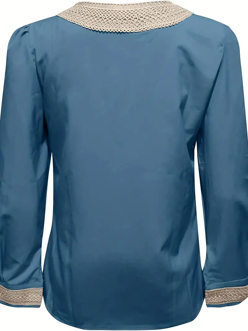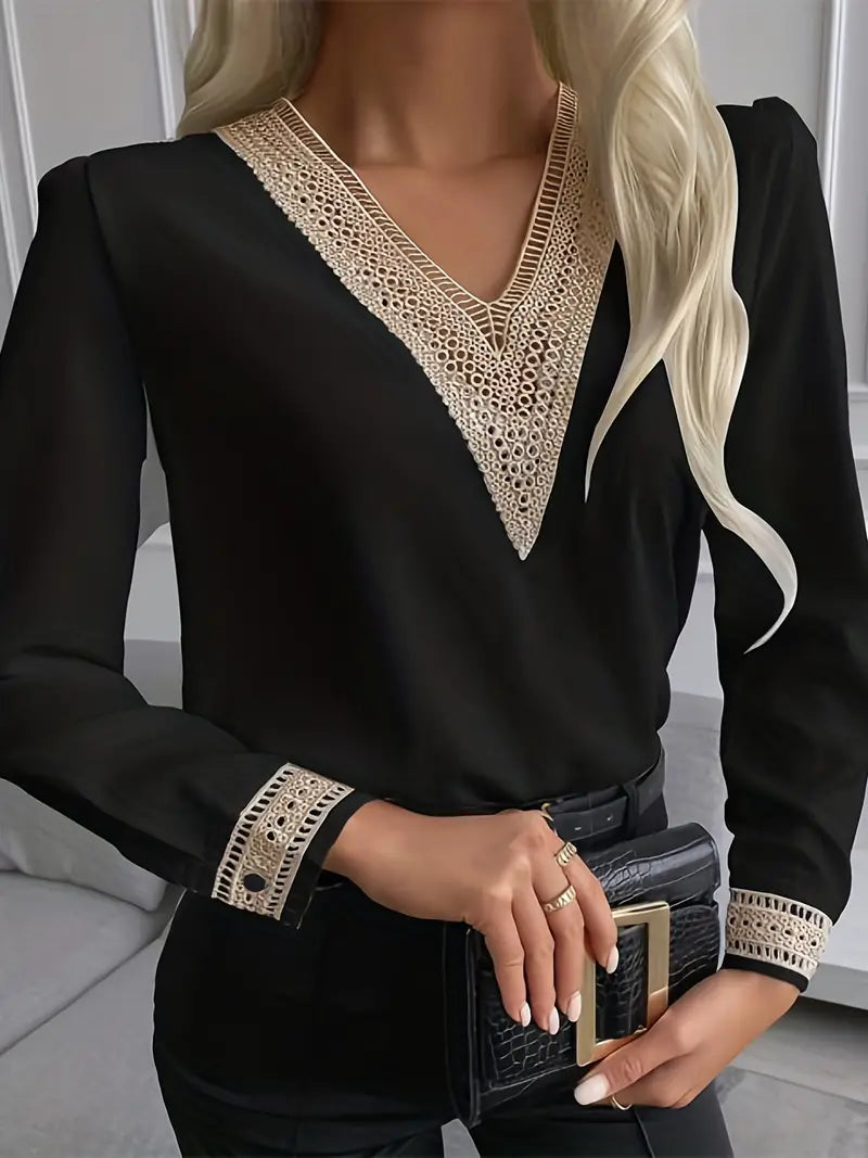 Blusa com decote em V com acabamento em renda, elegante manga longa