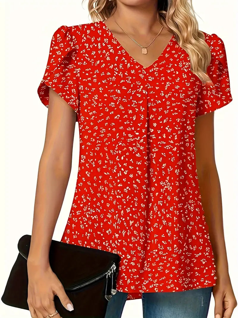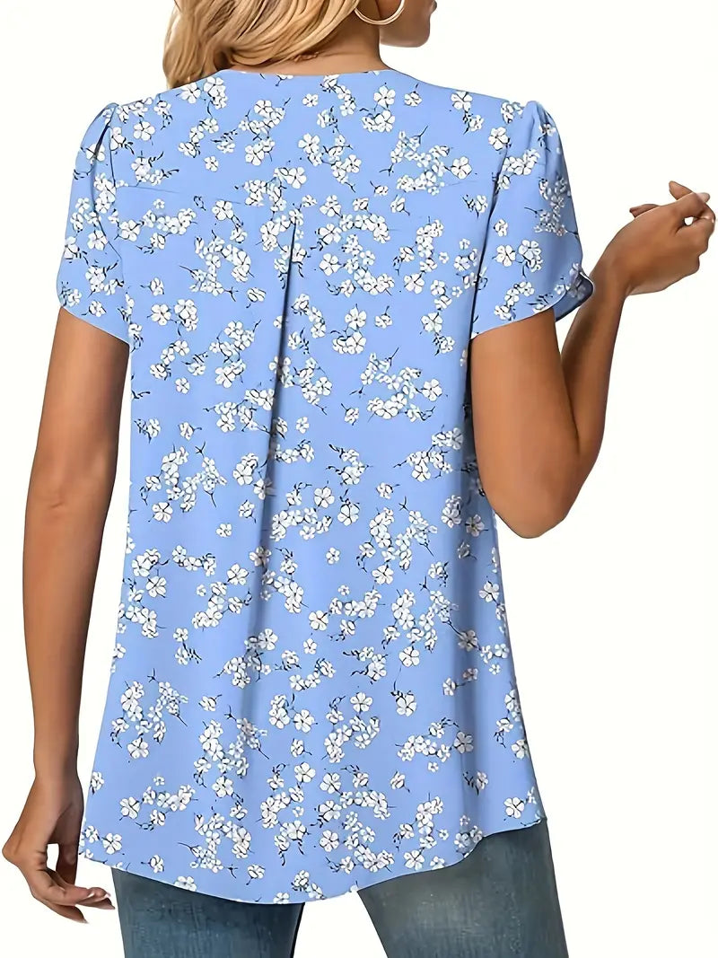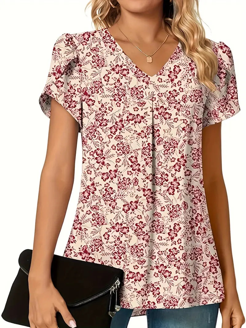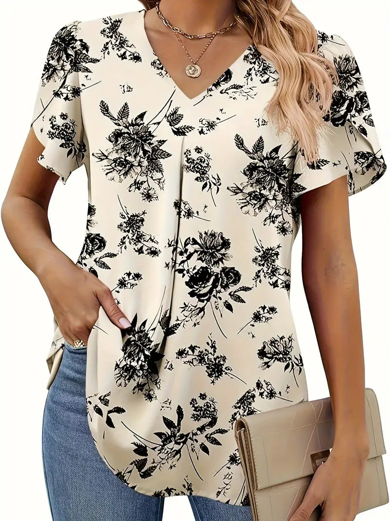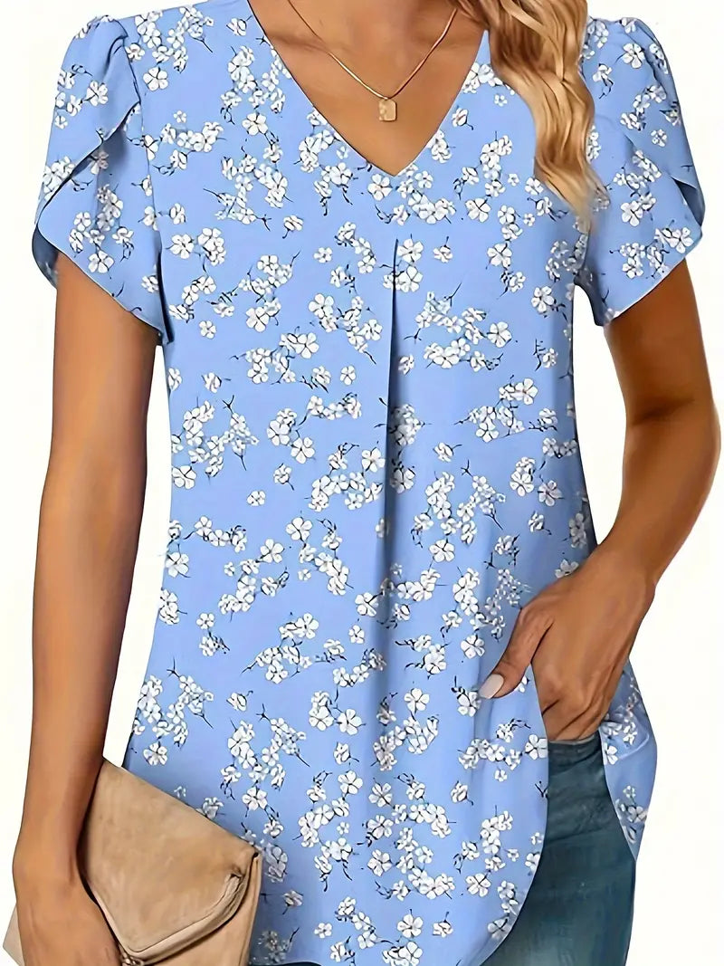 Blusa com estampa floral com decote em V, blusa casual manga pétala