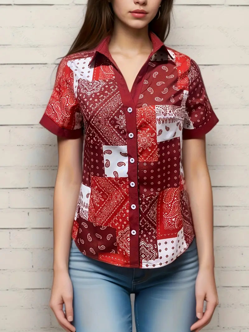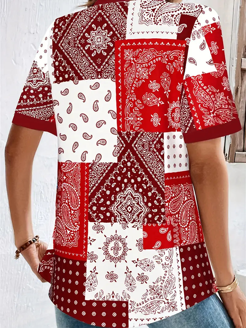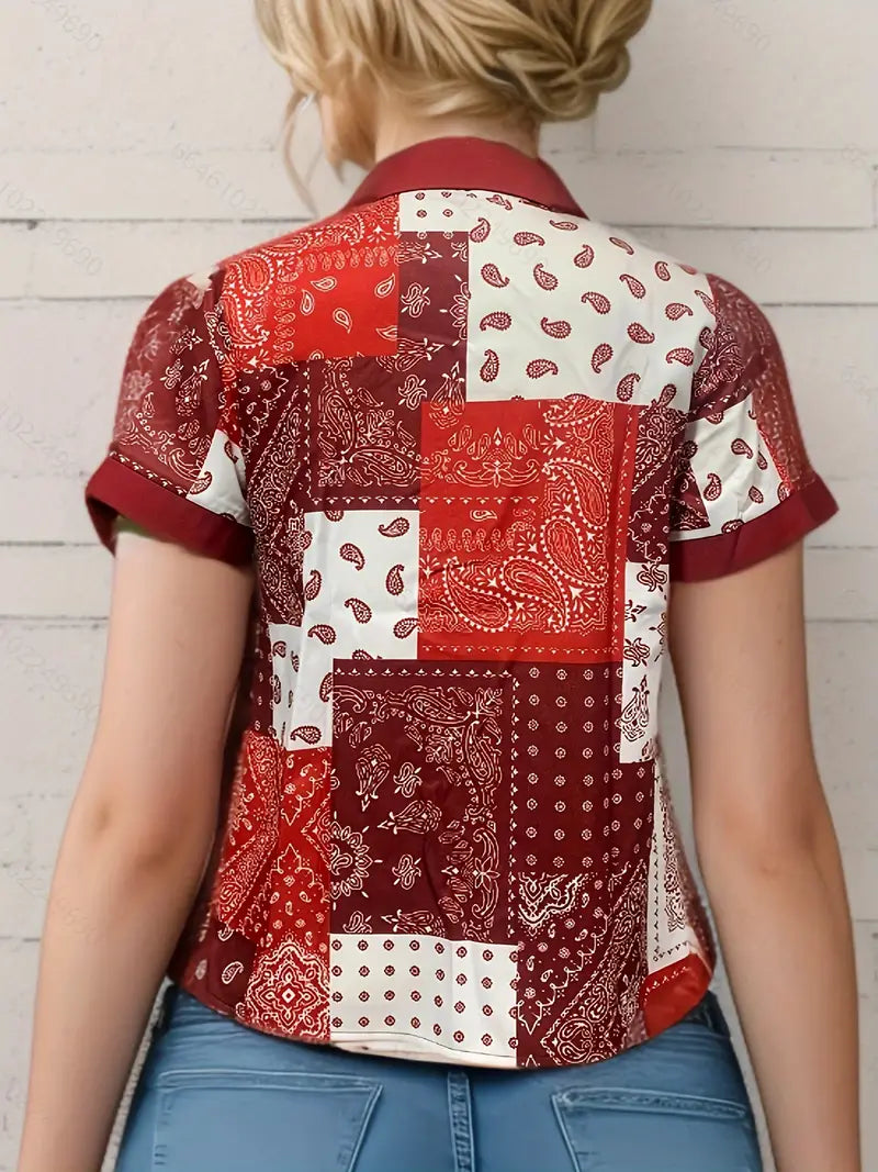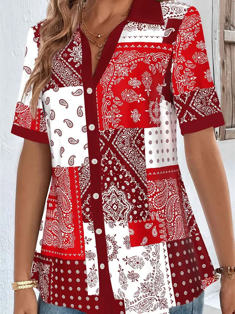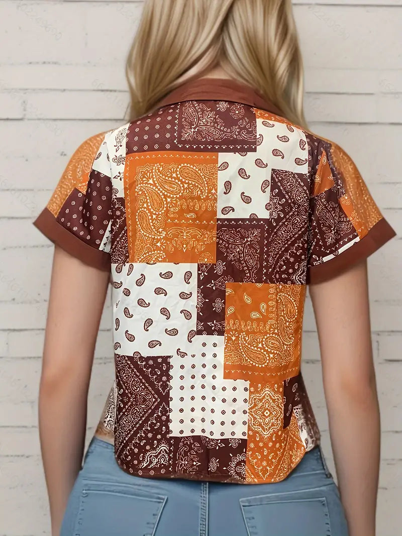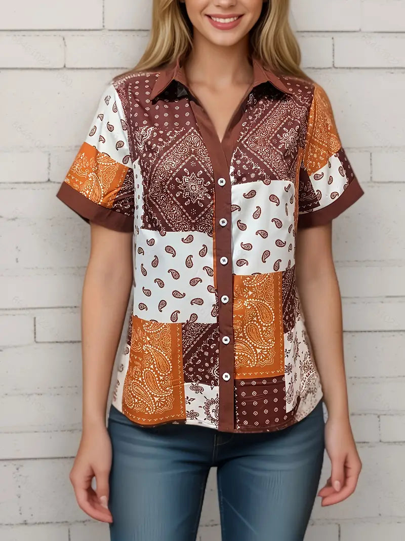 Blusa de emenda com estampa paisley, blusa casual de manga curta com botões