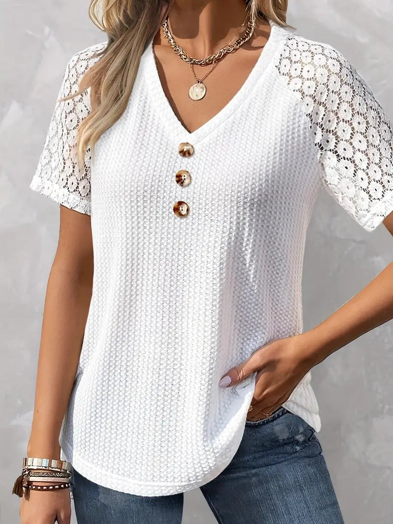 Blusa de manga curta elegante com decote em V sólido e renda frontal