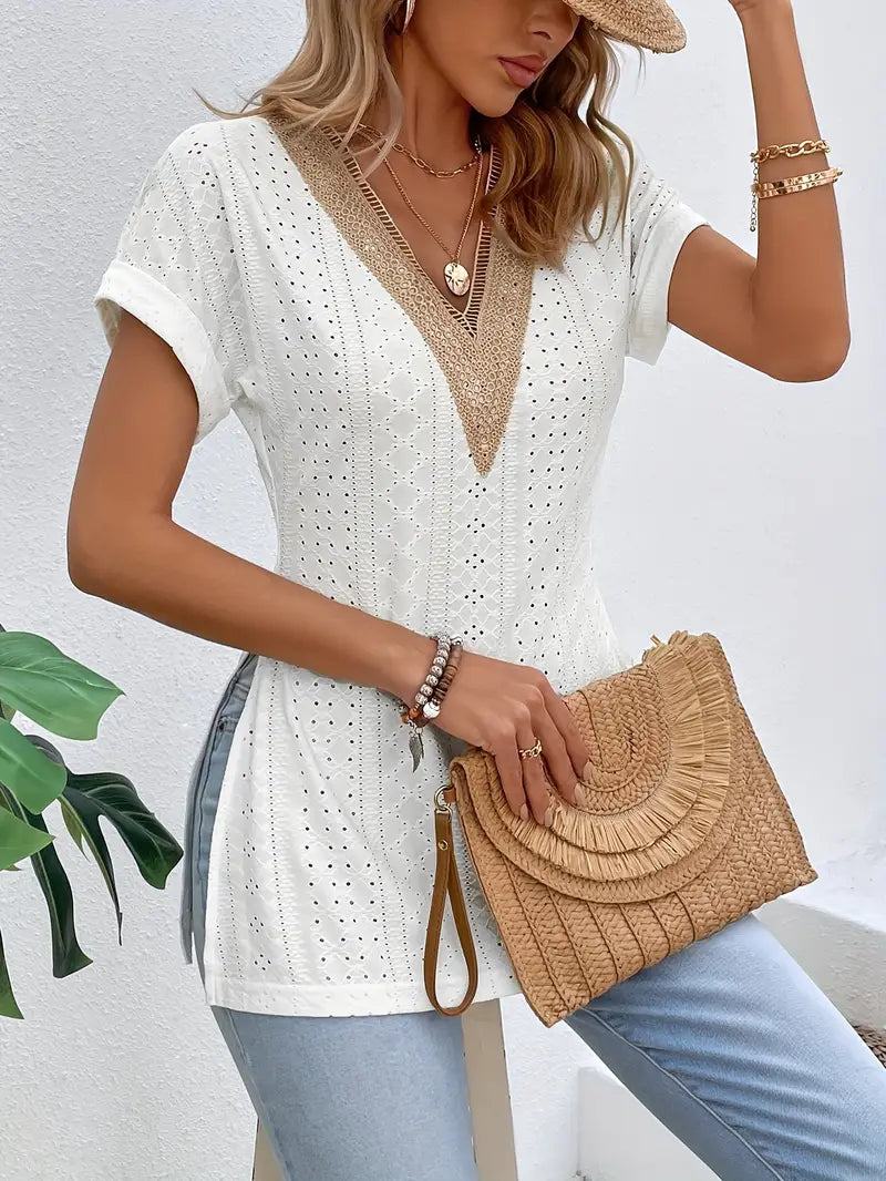 Blusa Guipure Lace , blusa elegante de manga curta enrolada com ilhó em V,
