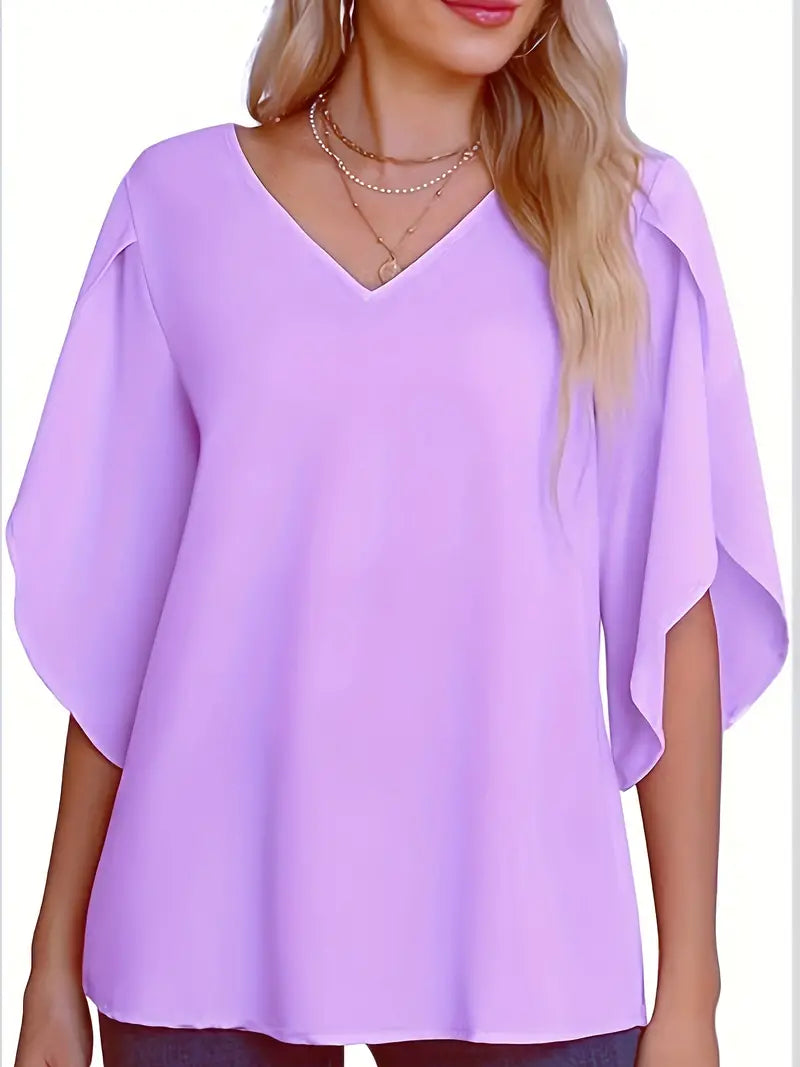 Blusa simples sólida com decote em V, blusa versátil de chiffon com manga pétala