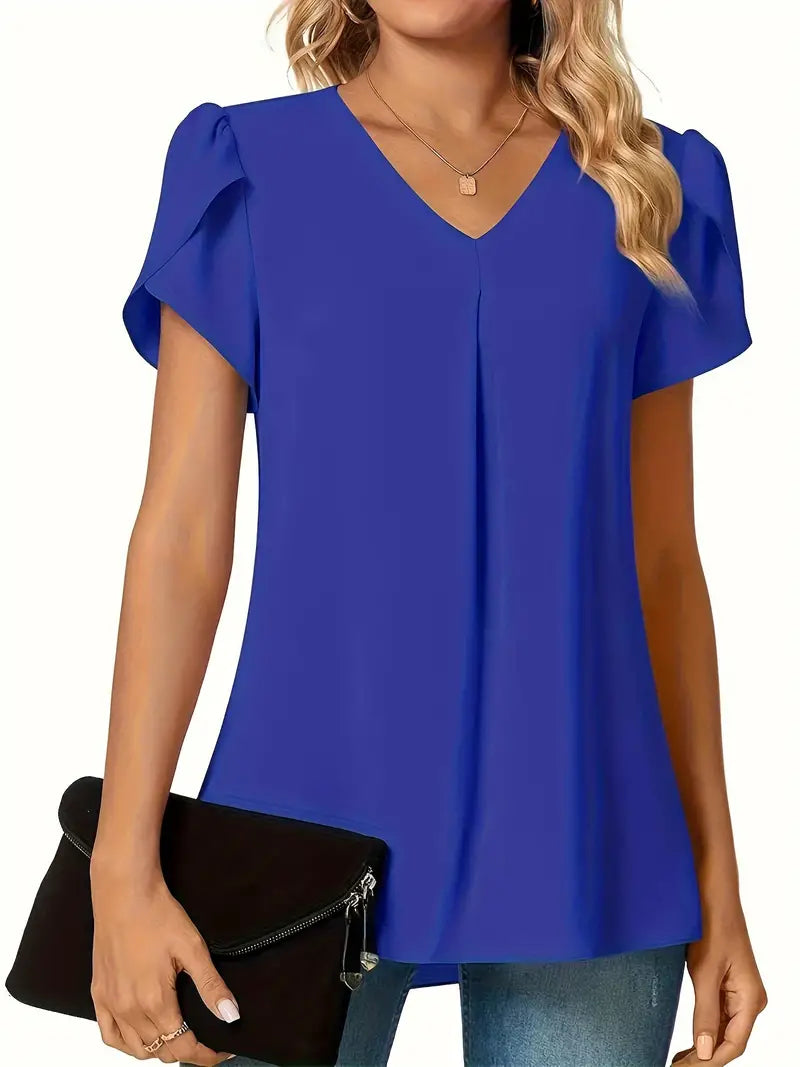 Blusa sólida com decote em V e manga pétala, blusa simples versátil