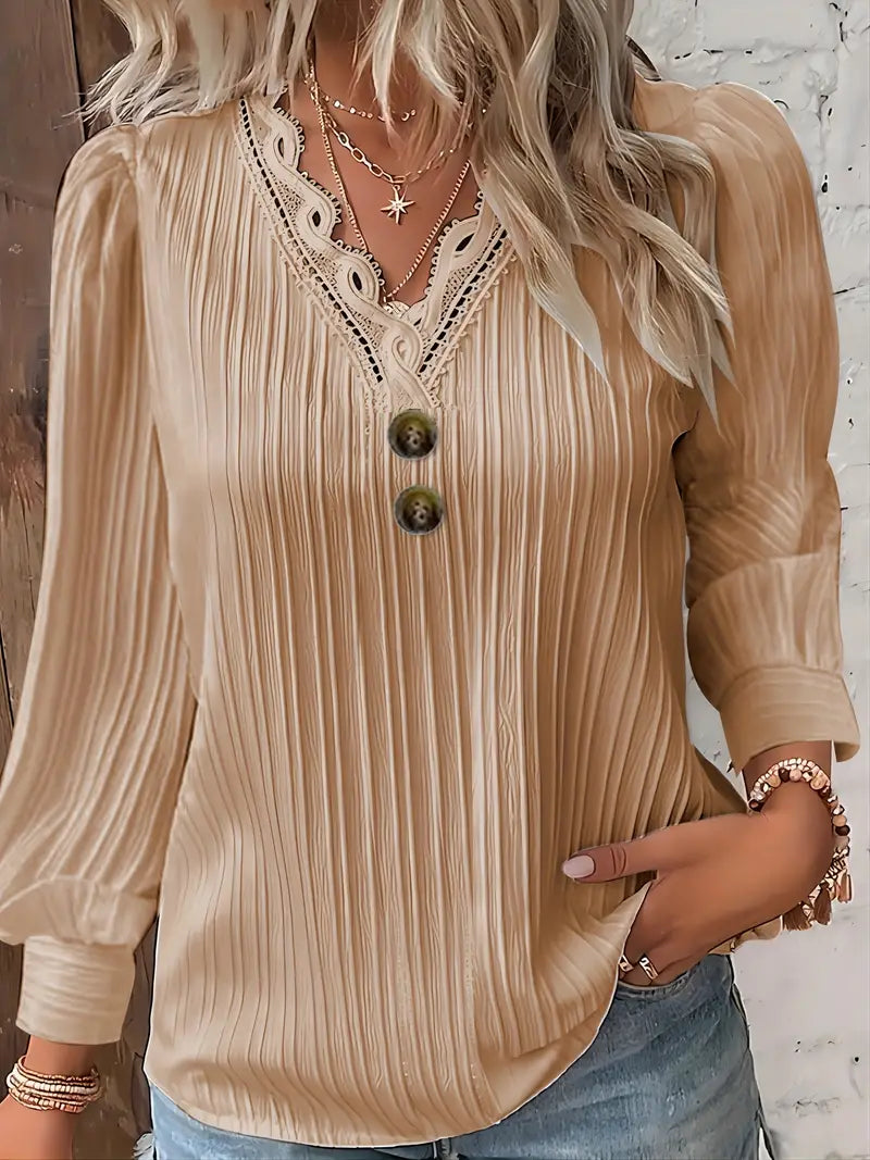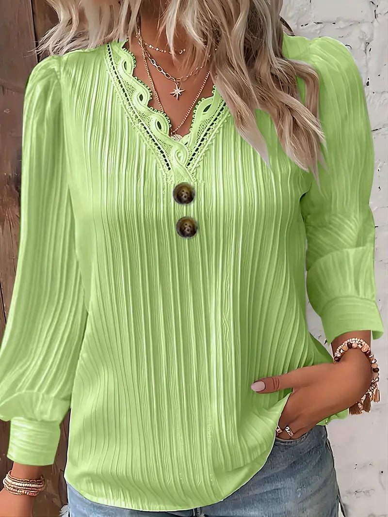 Blusa texturizada com decote em V com acabamento em renda, blusa casual de manga comprida com decoração de botões
