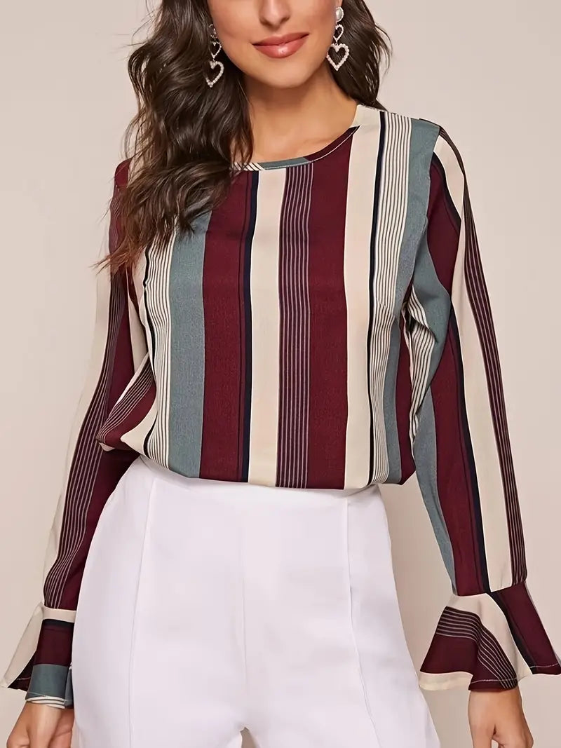 Blusas elegantes listradas com gola redonda, casual chiffon flare manga longa