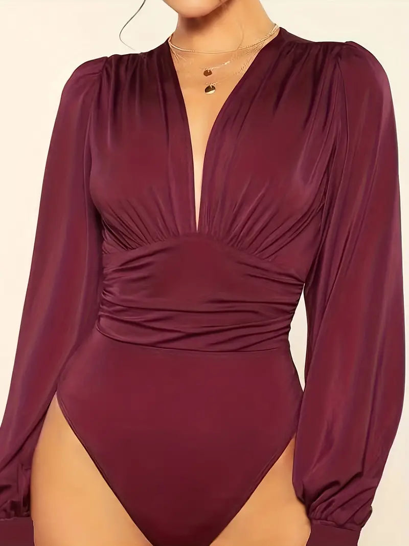 Body de manga comprida com decote em V sólido, sexy com babados, confortável e elegante