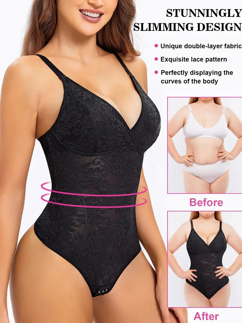 Body modelador de tanga de renda floral