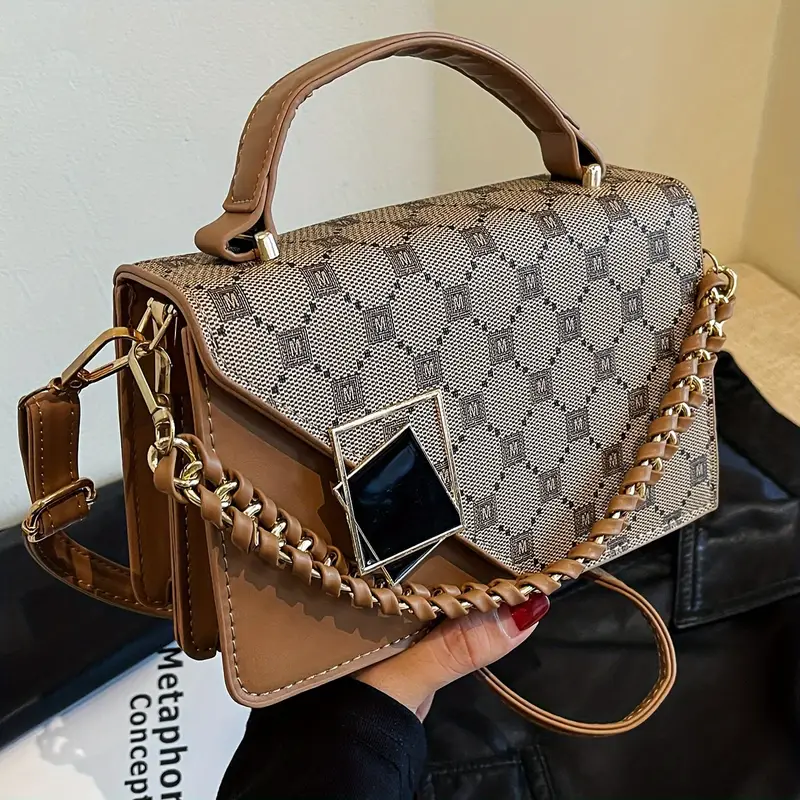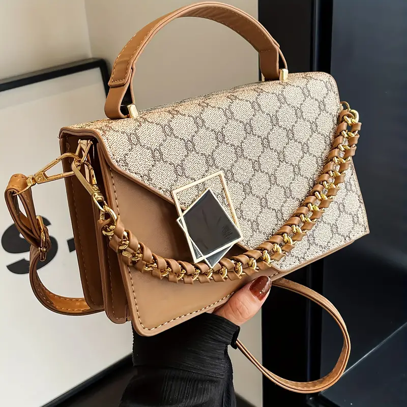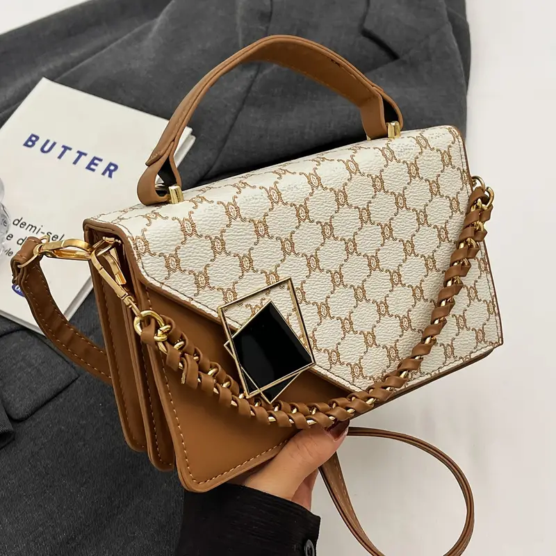 Bolsa de ombro quadrada com padrão geométrico elegante, carteira com alça superior colorblock para mulheres