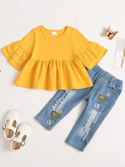 Calça jeans com bordado floral combinando com Blusa de manga comprida de algodão para meninas