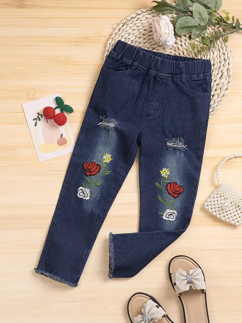 Calças jeans elásticas rasgadas com bordado floral para bebês e meninas