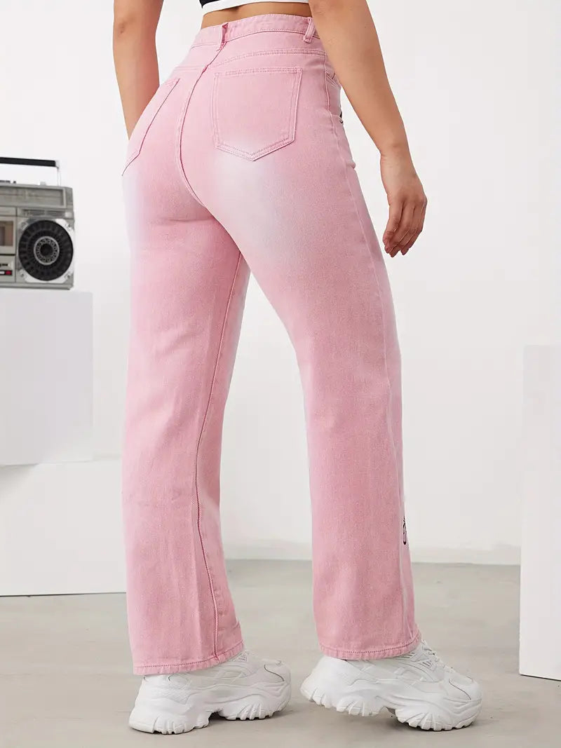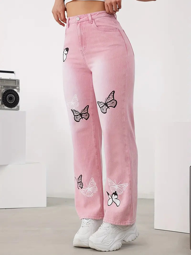 Calça jeans reta casual com estampa de borboleta, calça jeans com bolsos inclinados e ajuste solto, calça jeans feminina