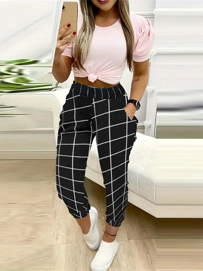 Calça jogger slim com estampa xadrez, calça casual com bolso inclinado e cordão