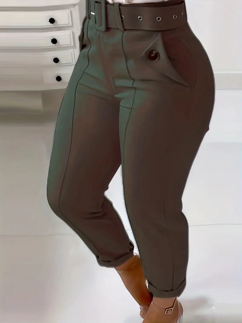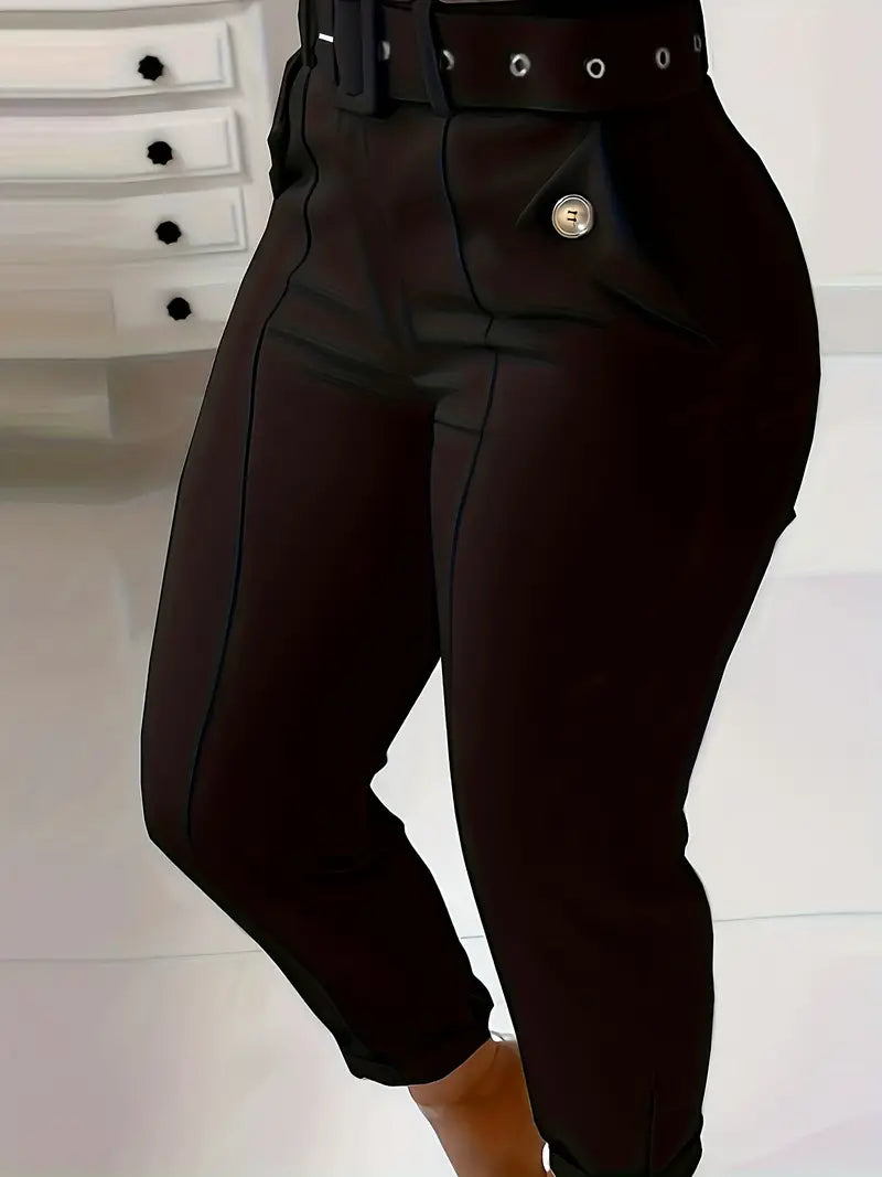Calça skinny com cinto sólido, calça com botão de bolso inclinado
