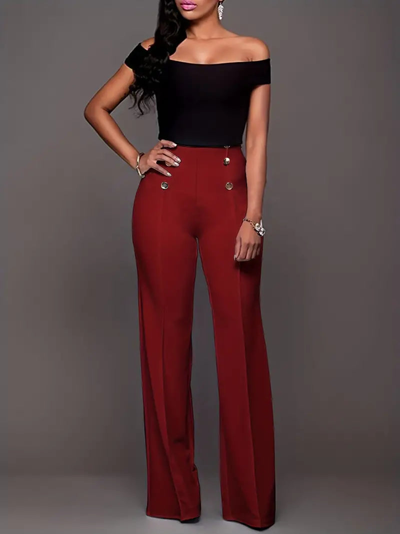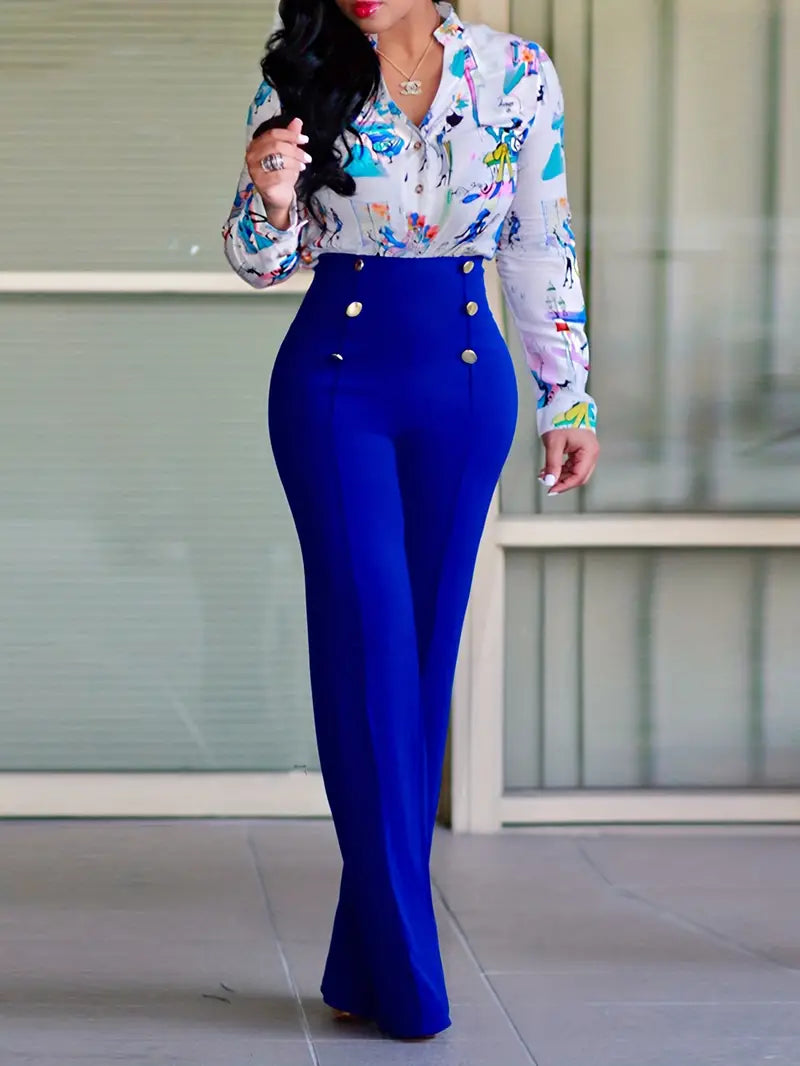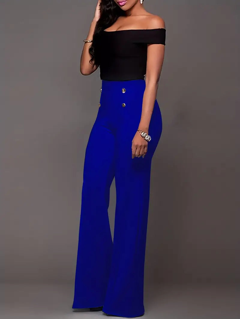Calças elásticas de botão casual, calças soltas de cintura alta sólida moda confortável