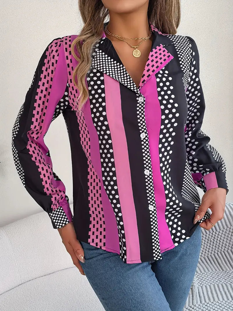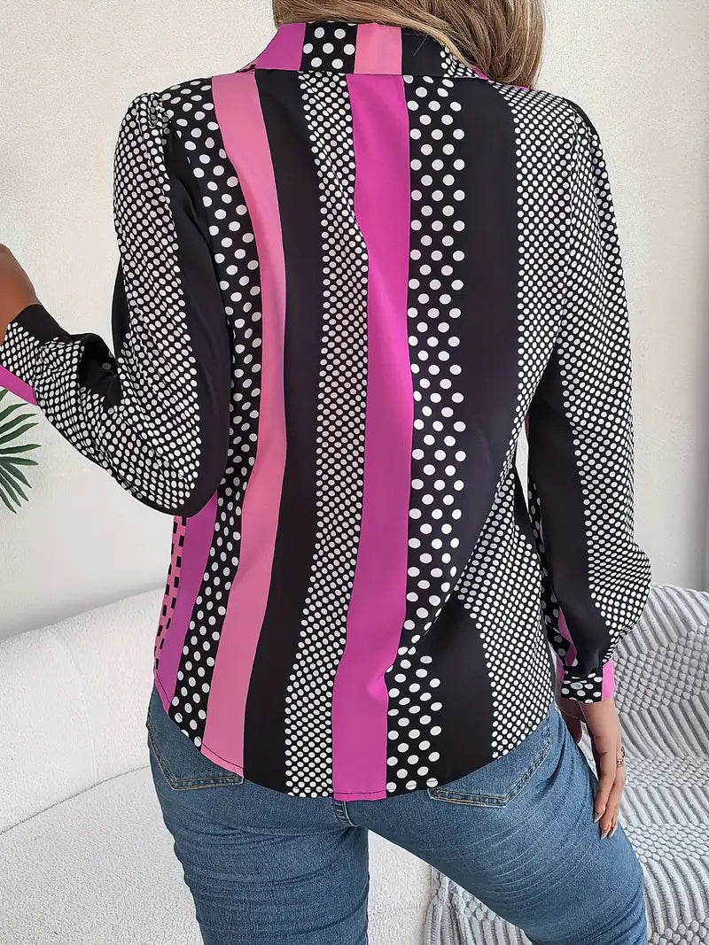 Camisa com estampa de listras e bolinhas, camisa casual de manga comprida com botões na frente, roupas femininas