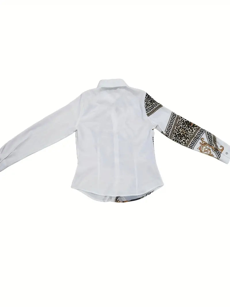 Camisa de emenda com estampa de tigre, camisa casual de manga comprida com botão frontal e gola virada para baixo
