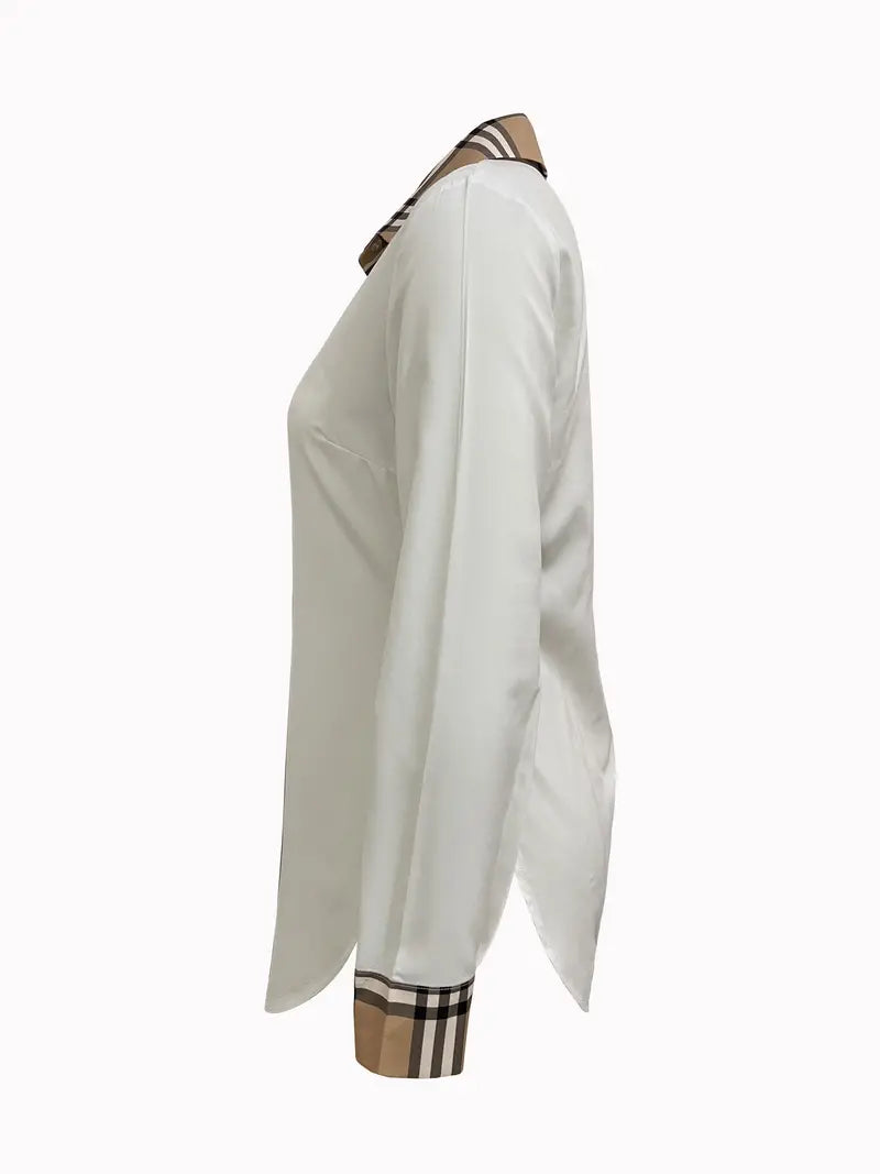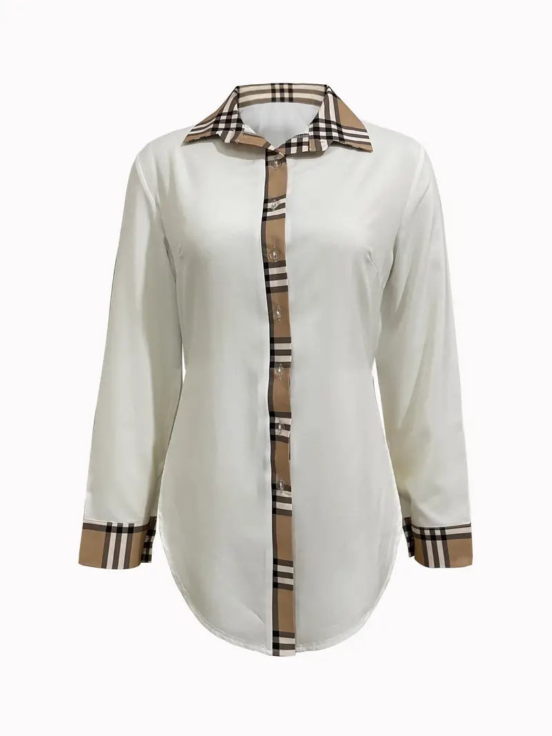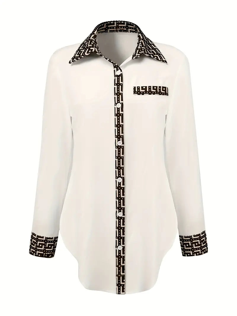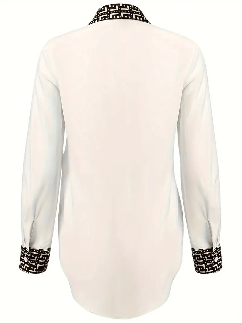 Camisa dividida com acabamento contrastante, camisa elegante de manga comprida frontal com botões