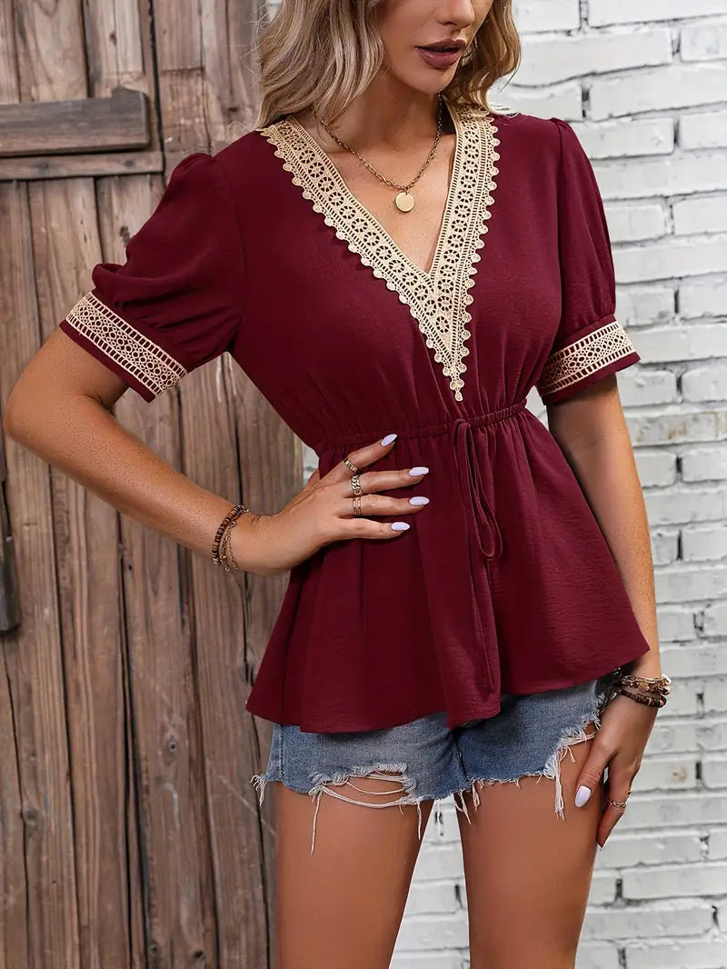 Camiseta de renda lisa com cordão, camiseta casual com decote em V manga curta e cordão