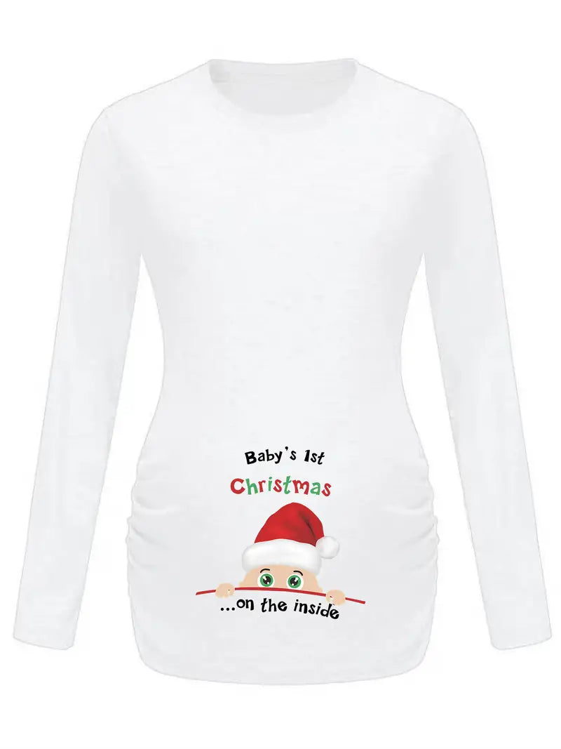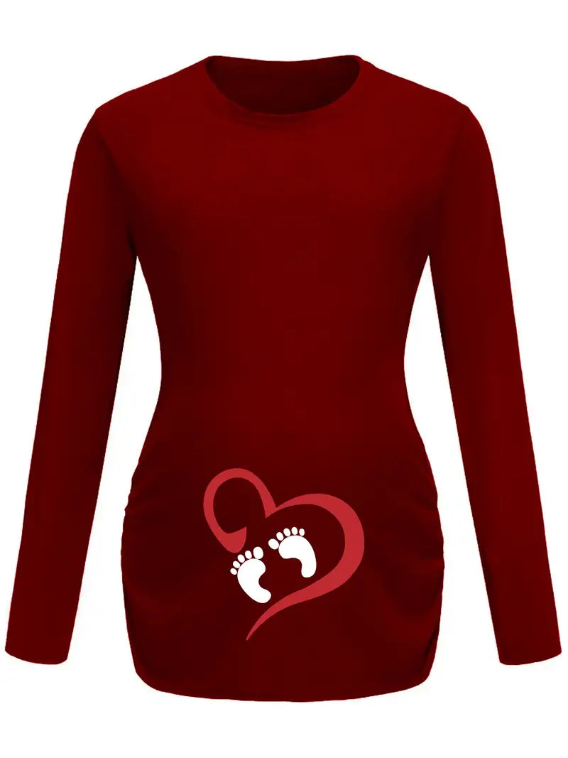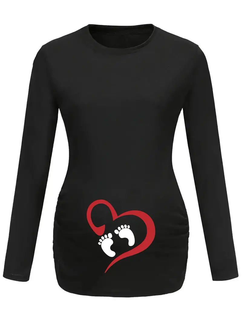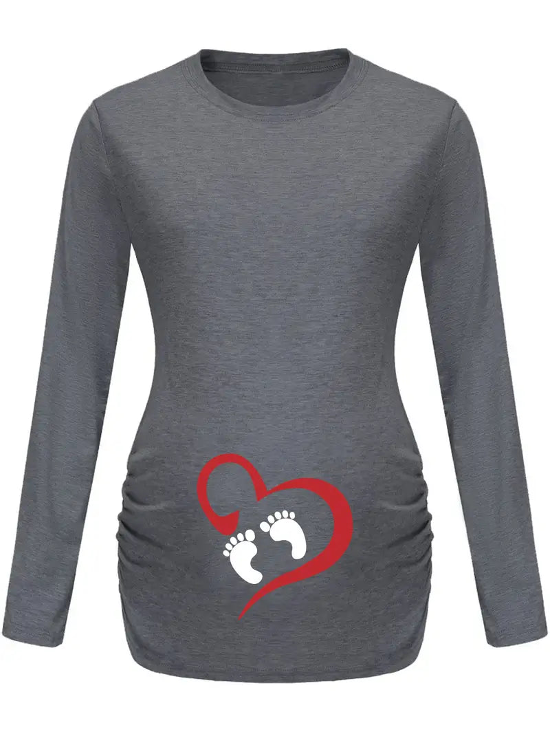 Camiseta feminina de manga comprida com estampa de coração e pegada para gestantes