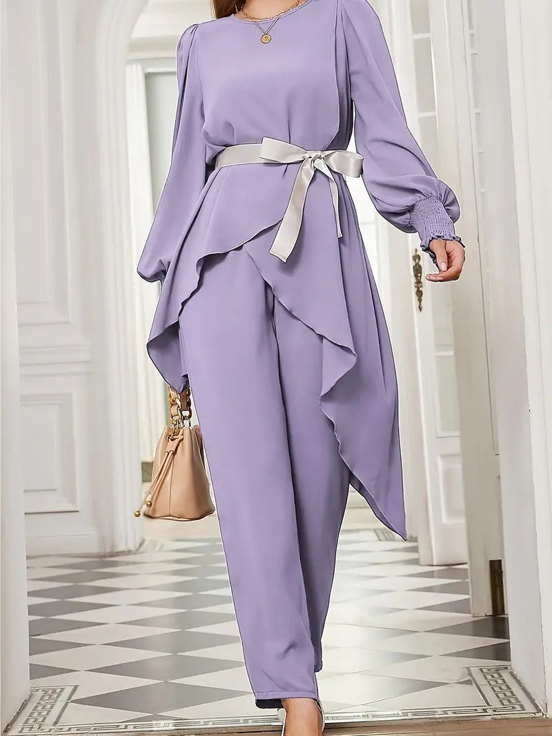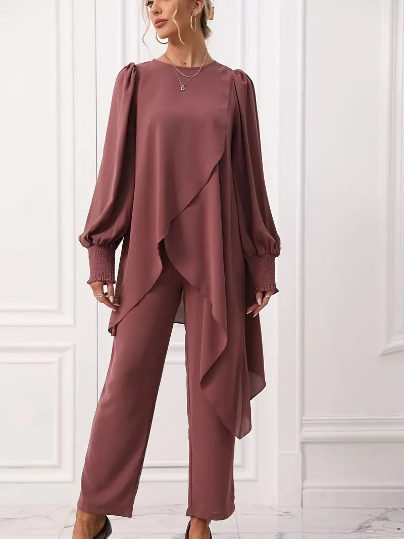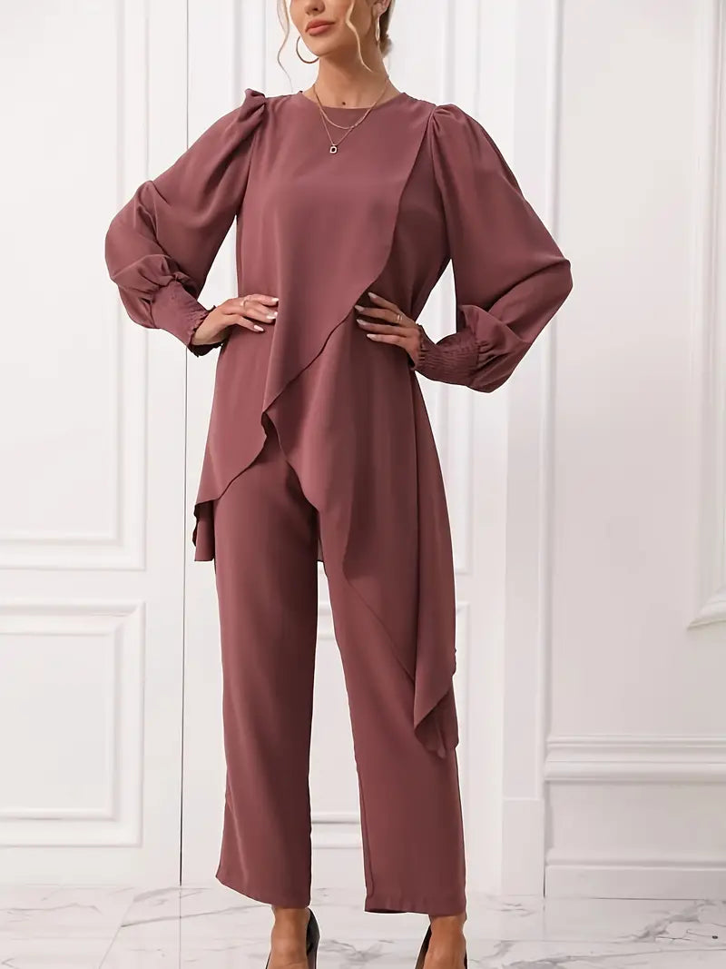 Conjunto casual de duas peças, top de manga comprida com bainha assimétrica e roupas de calças