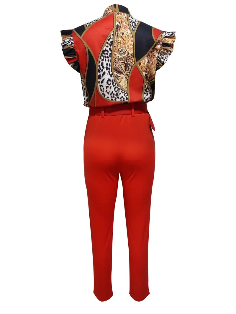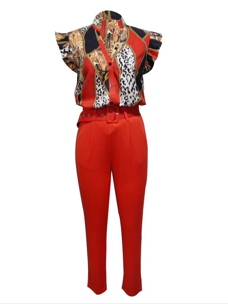 Conjunto de duas peças colorblock com estampa de leopardo, blusa com botão de manga esvoaçante e calças finas com cinto
