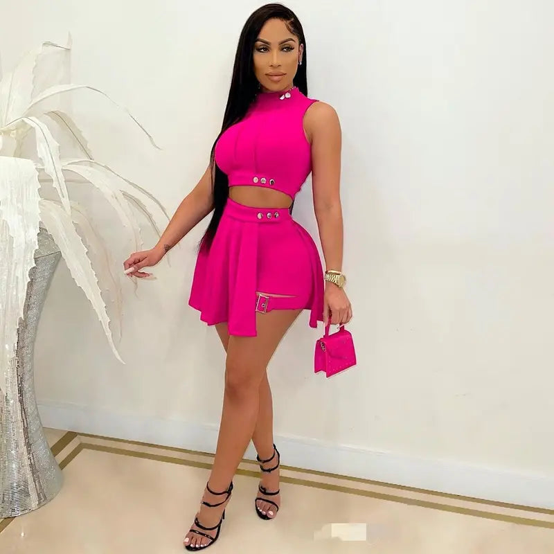 Conjunto de duas peças com botões sexy, regata cropped com gola simulada e saia de cintura alta