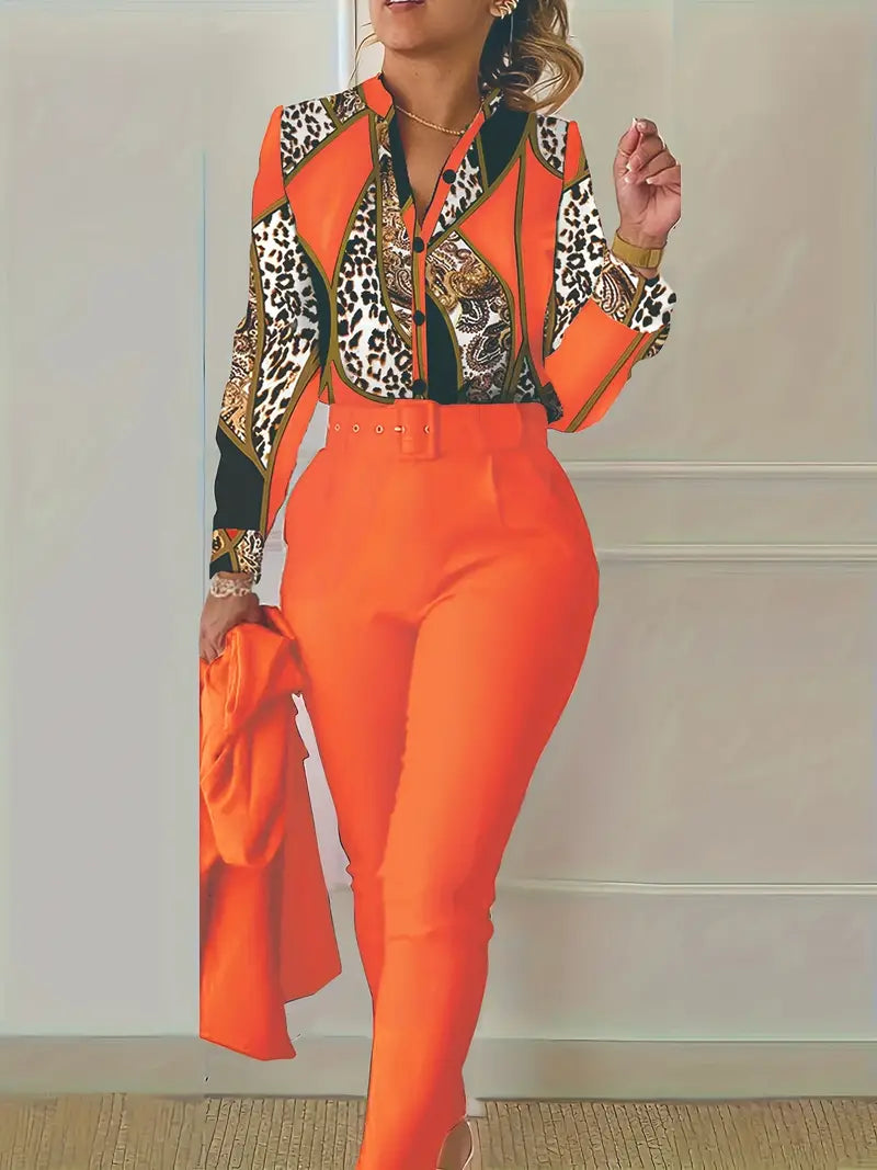 Conjunto de duas peças com estampa de leopardo, top de manga comprida com botão frontal e calças de cintura alta