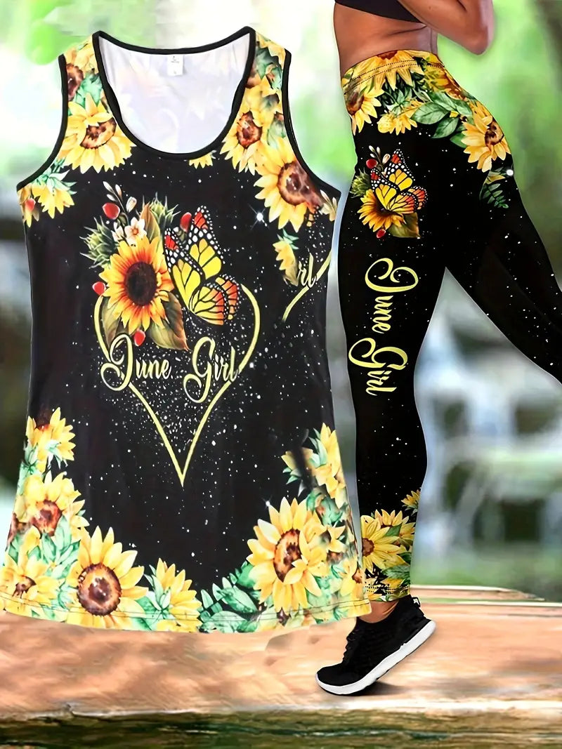 Conjunto de duas peças de fitness com estampa de girassol, de cintura alta para ioga