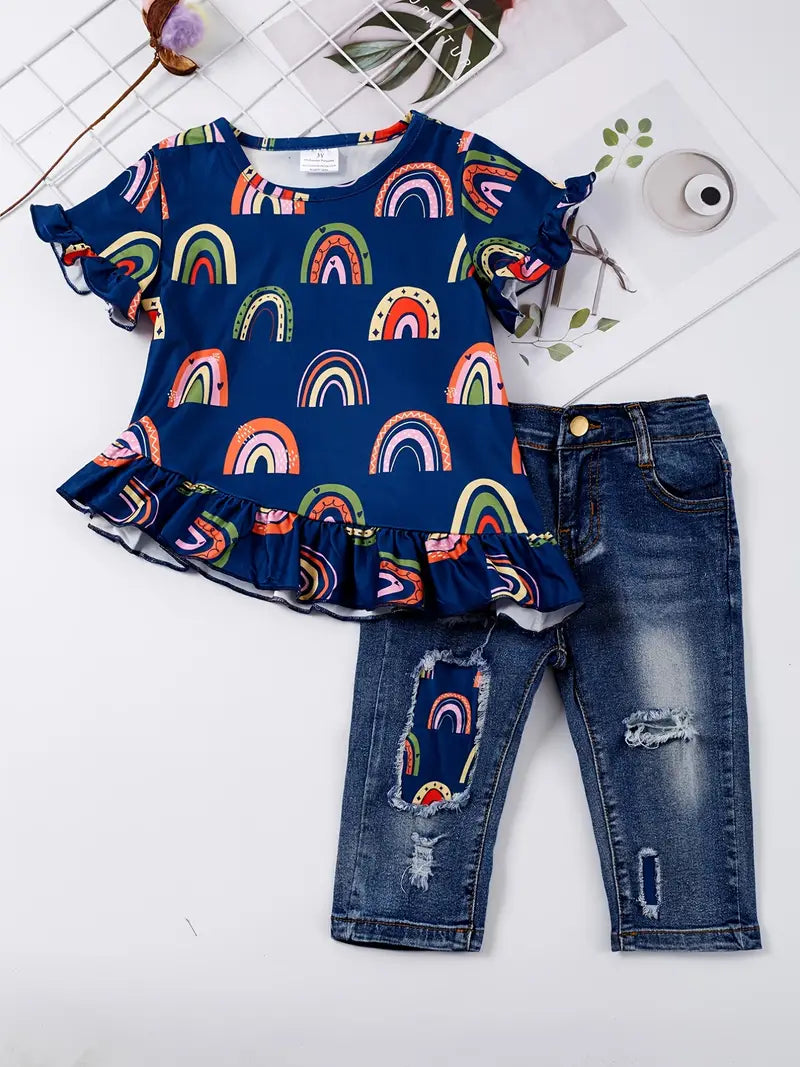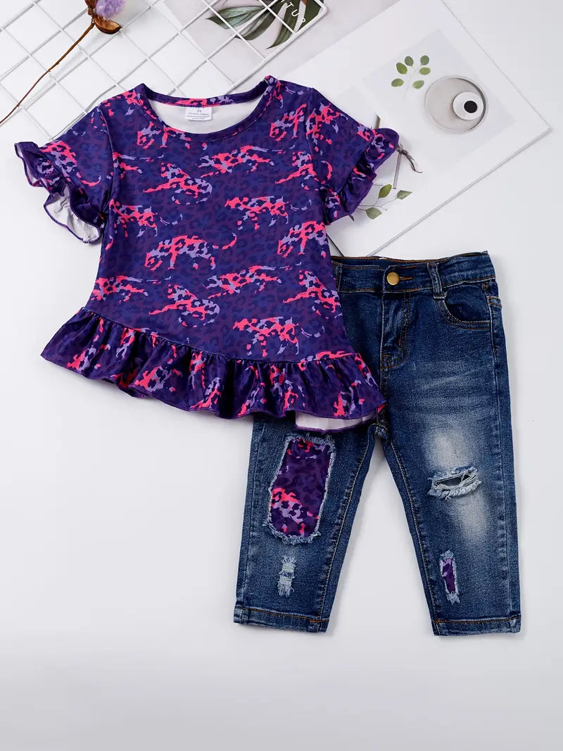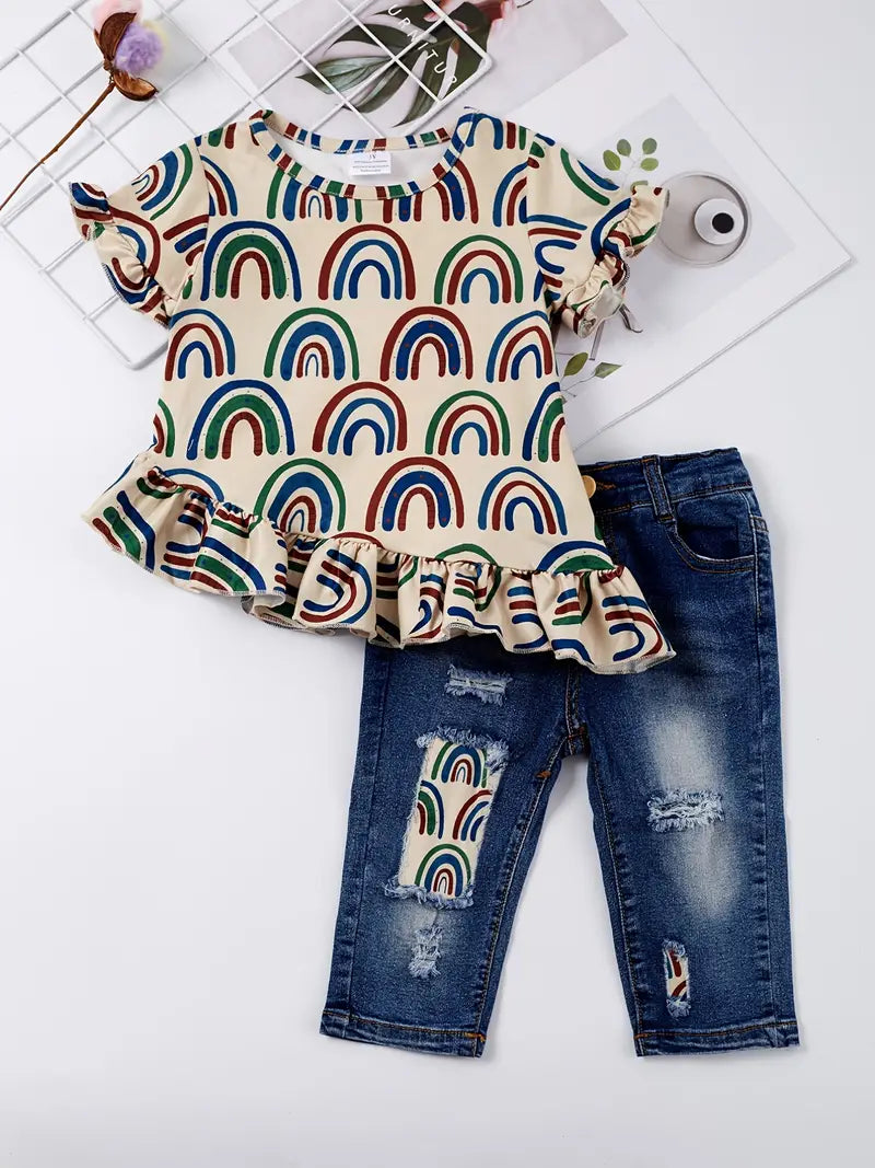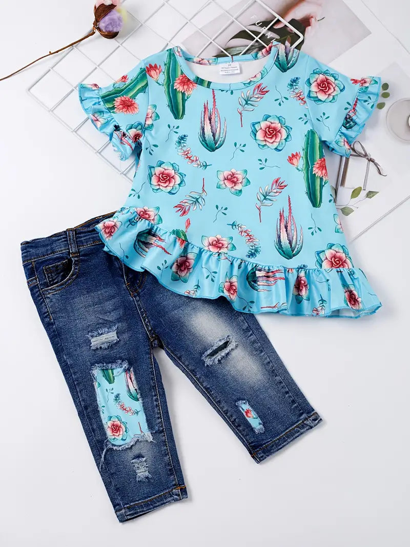 Conjunto de top e jeans rasgados roupas para bebês e meninas, com babados, manga curta,