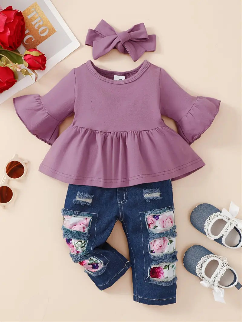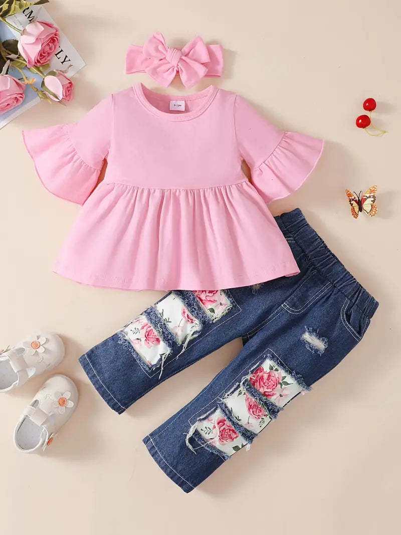 Conjunto de top e jeans rasgados roupas para bebês, blusa de manga curta
