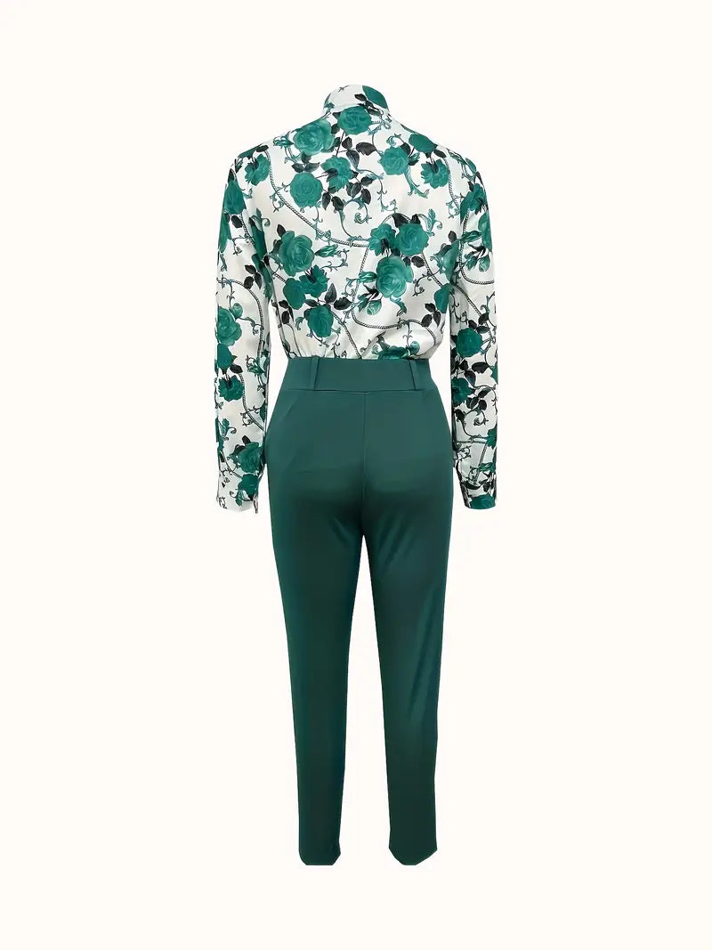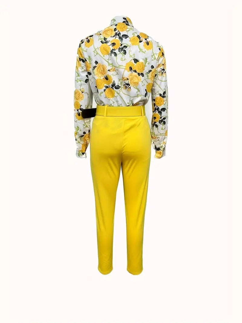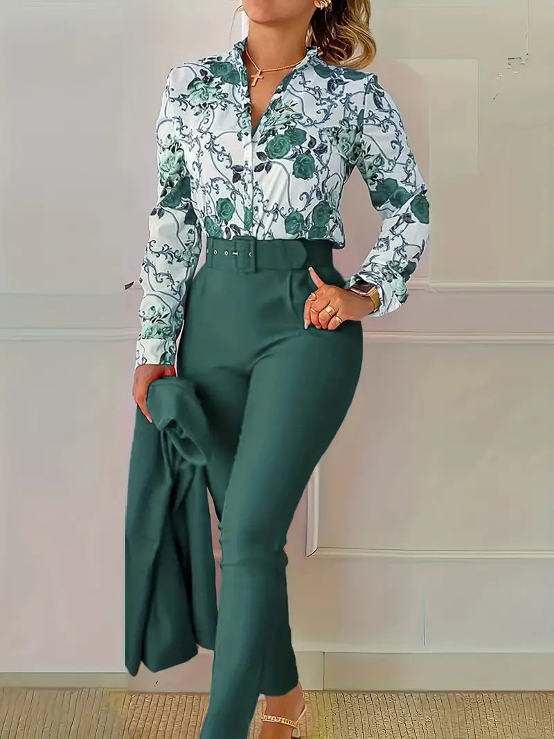 Conjunto elegante de duas peças, blusa de manga comprida com estampa floral com decote em V e calças com cinto sólido