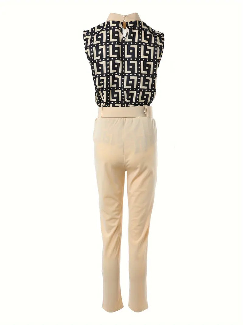 Conjunto elegante de duas peças, regata com gola simulada e calças sólidas com cinto