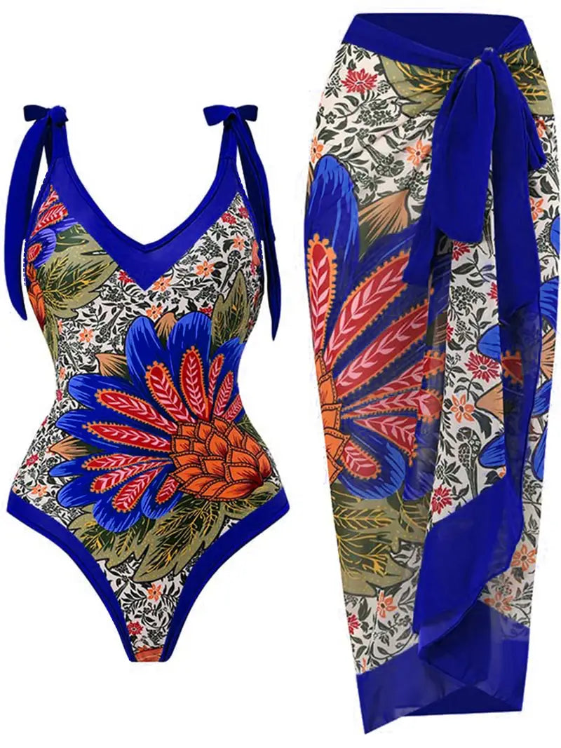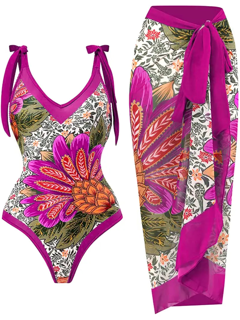 Fato de banho de2 peças com estampa floral de ombro único e maxi vestido de cobertura, decote em V profundo com acabamento contrastante elegante maiô de
