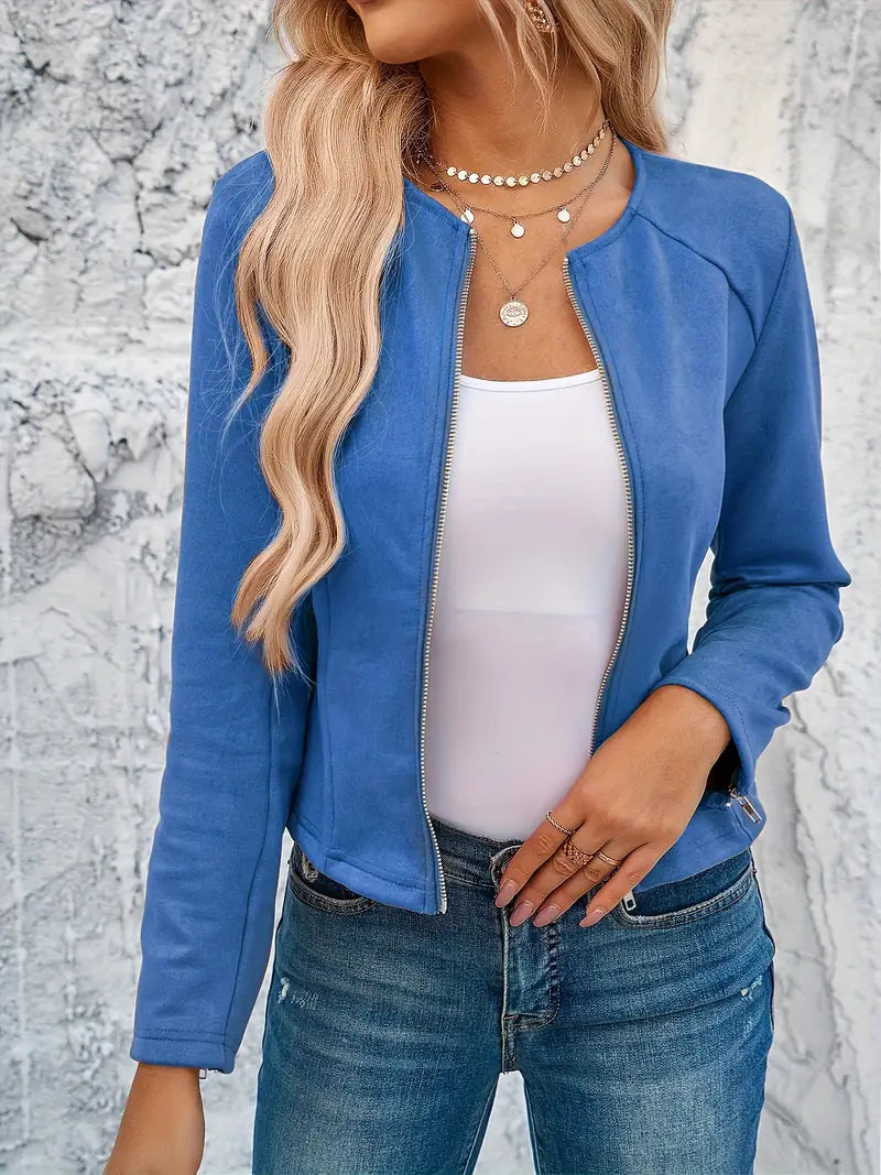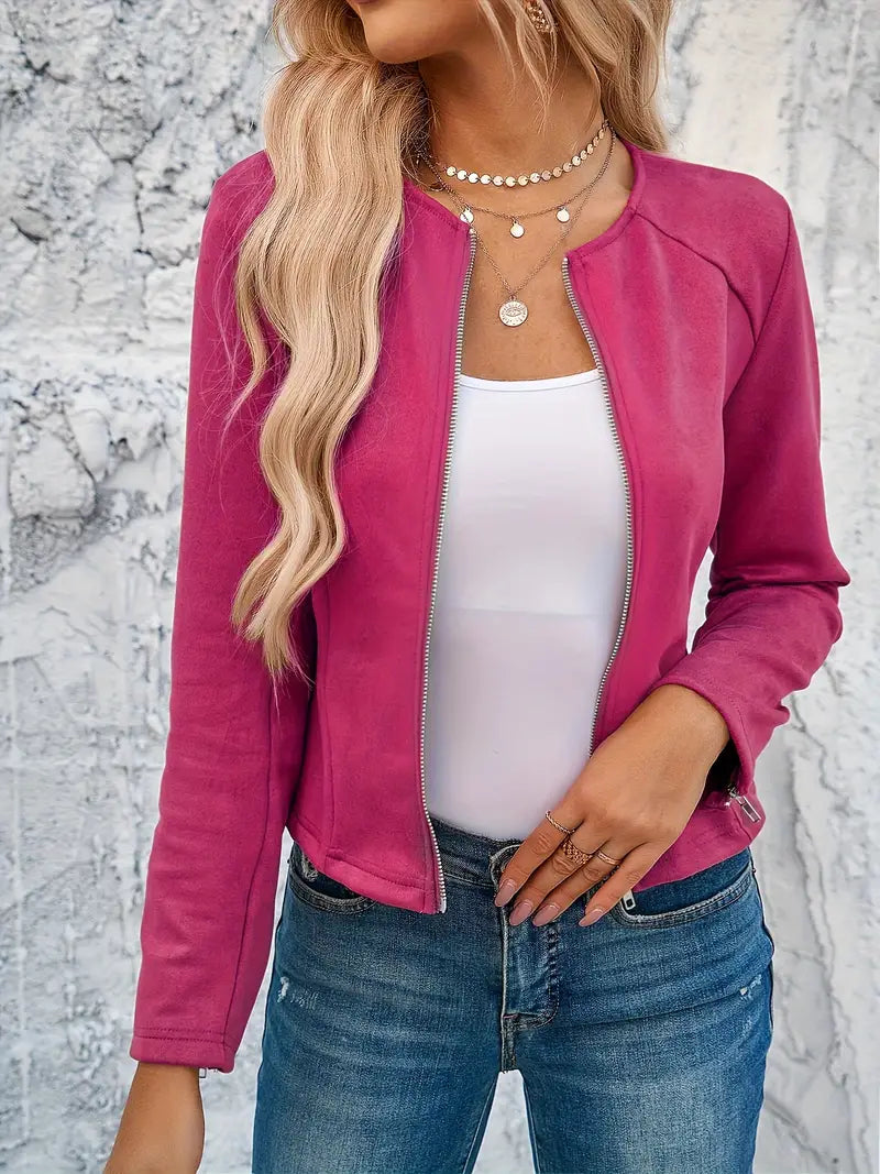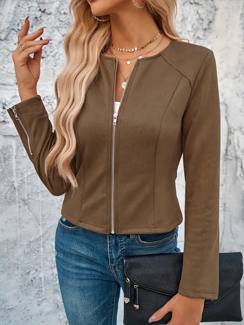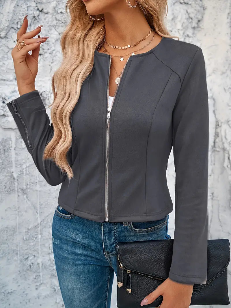 Jaqueta feminina elegante com zíper sólido, estilo casual moderno de manga comprida