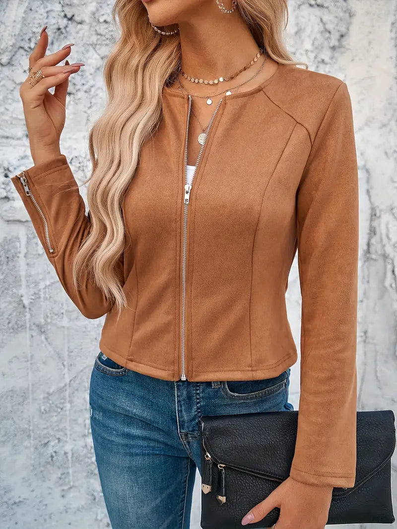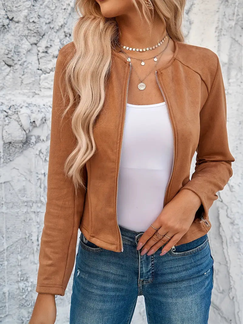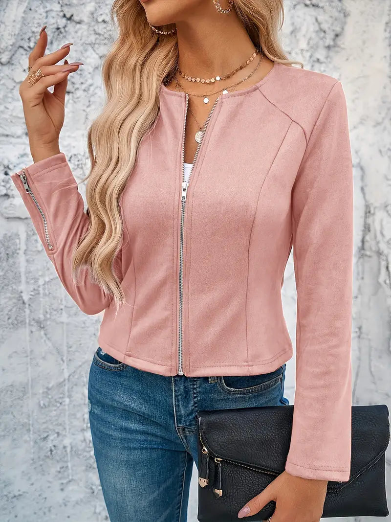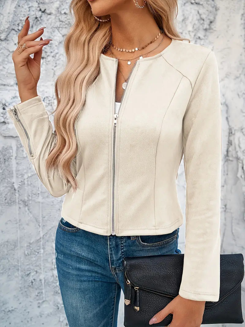 Jaqueta feminina elegante com zíper sólido, estilo casual moderno de manga comprida