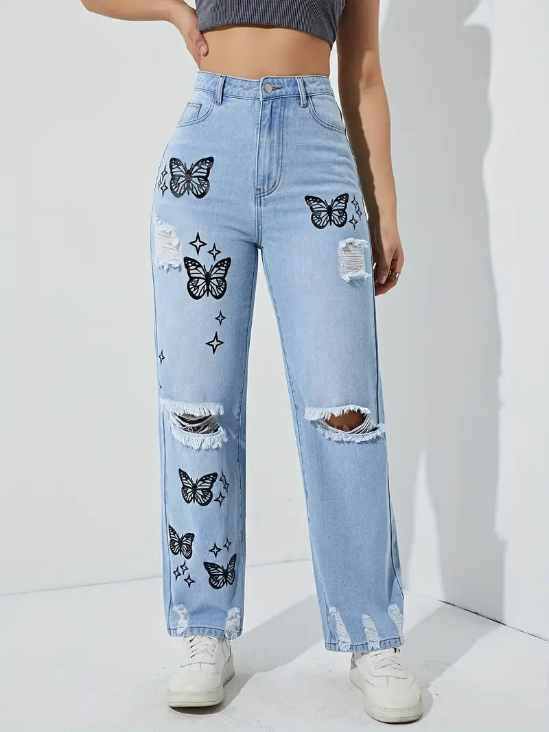 Jeans de borboleta com detalhes rasgados, jeans de cintura alta desgastados com estampa de estrela
