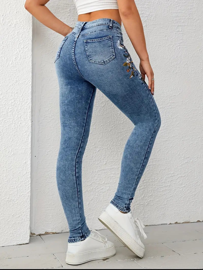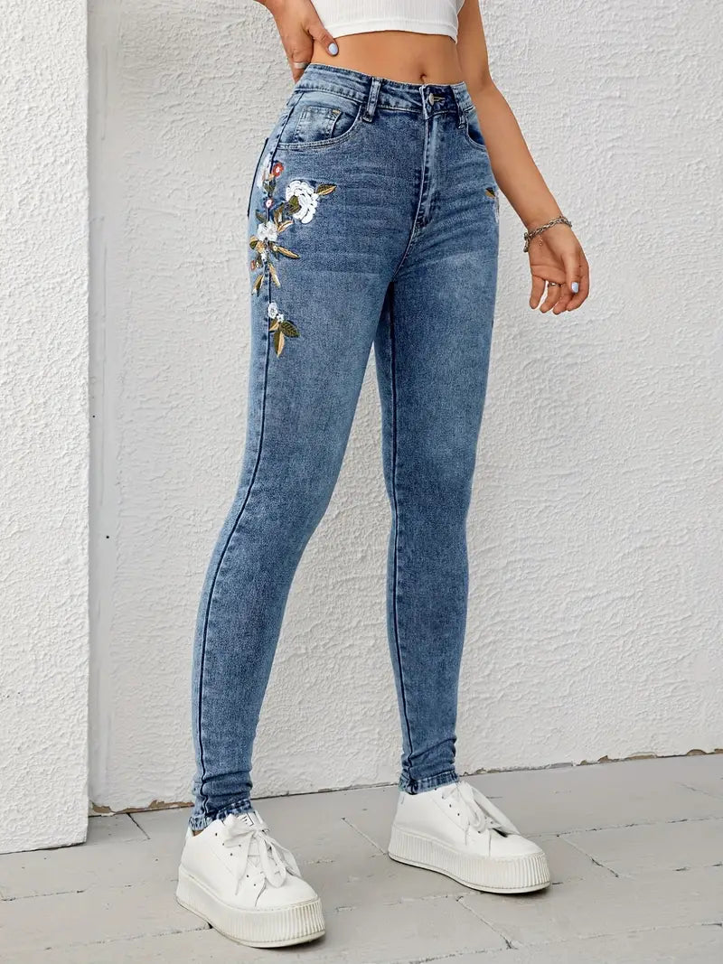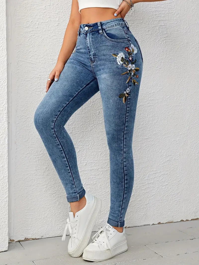Jeans skinny bordados florais azuis, bolsos cortados justos, calças jeans de cintura alta
