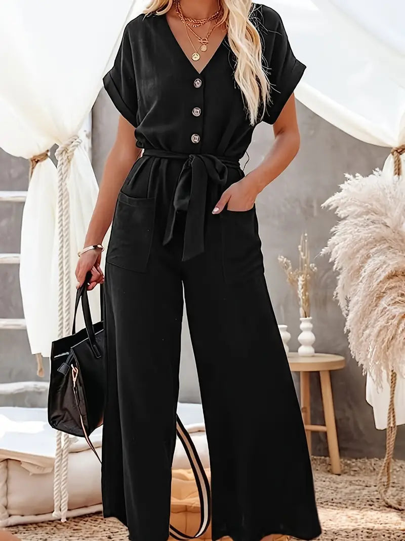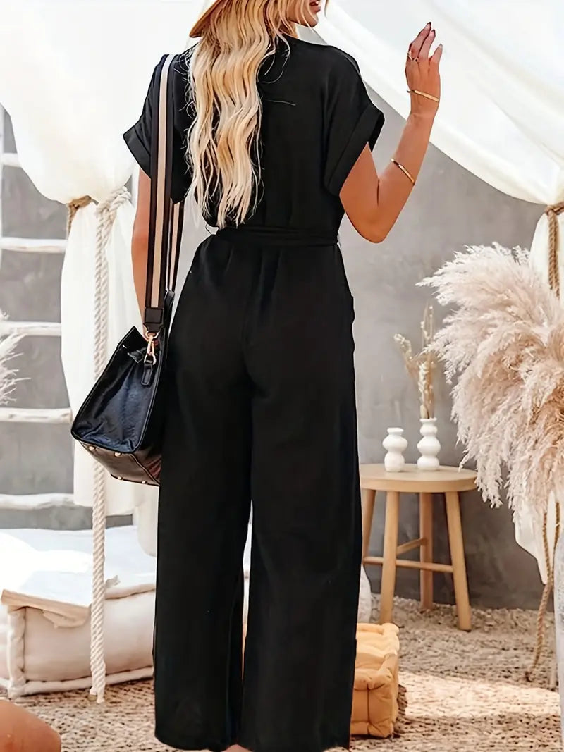 Macacão de perna larga com decote em V sólido, macacão casual de manga curta com bolso