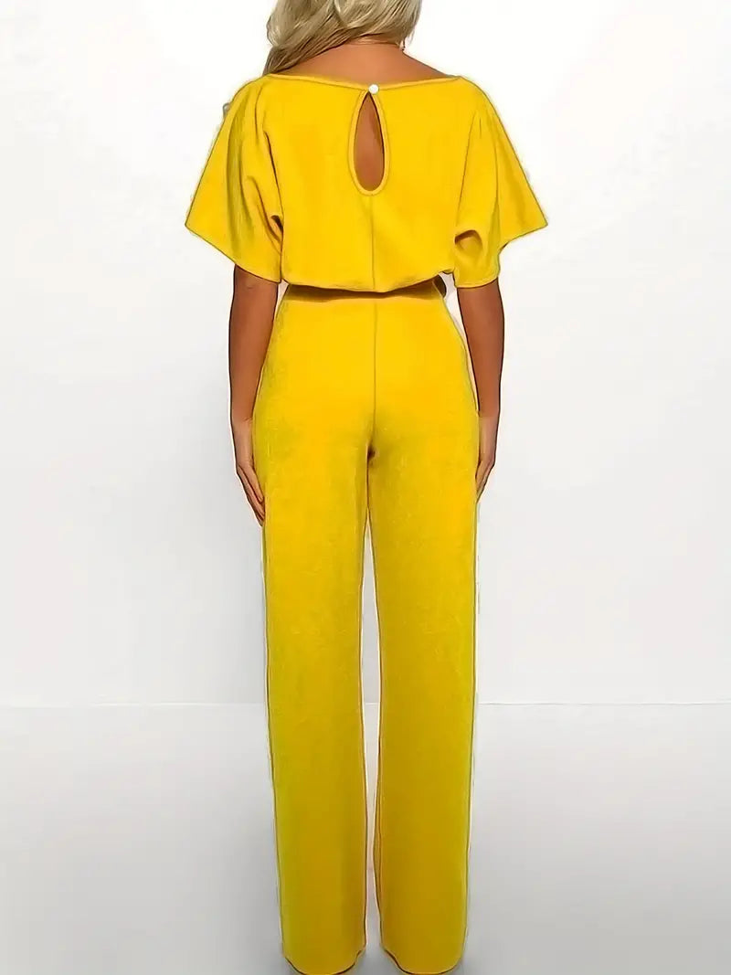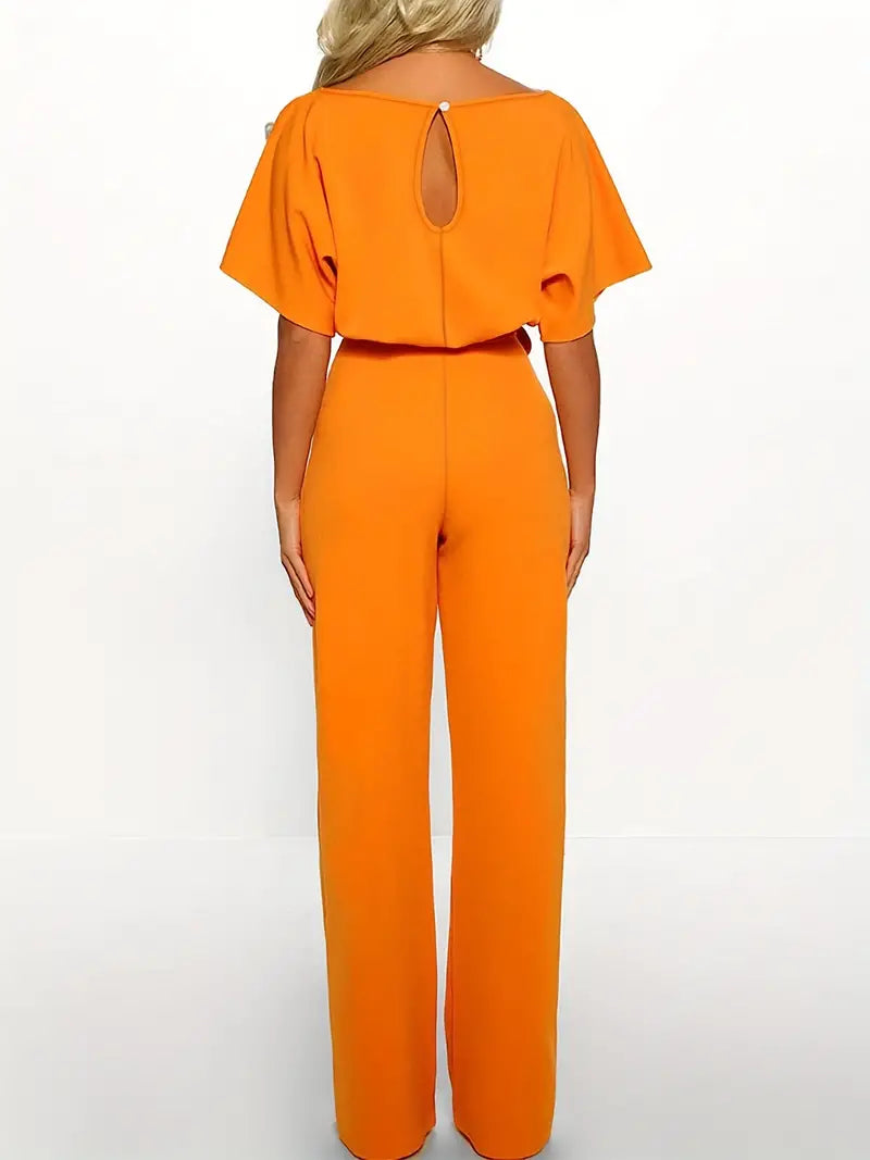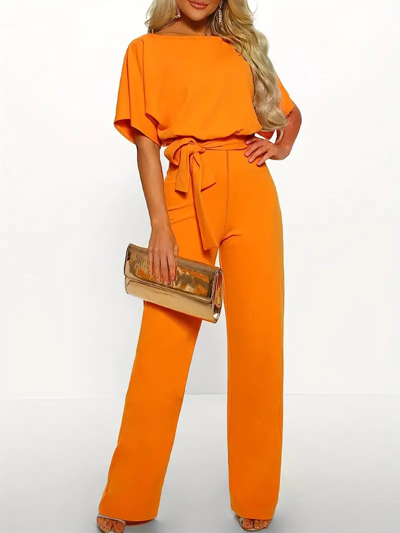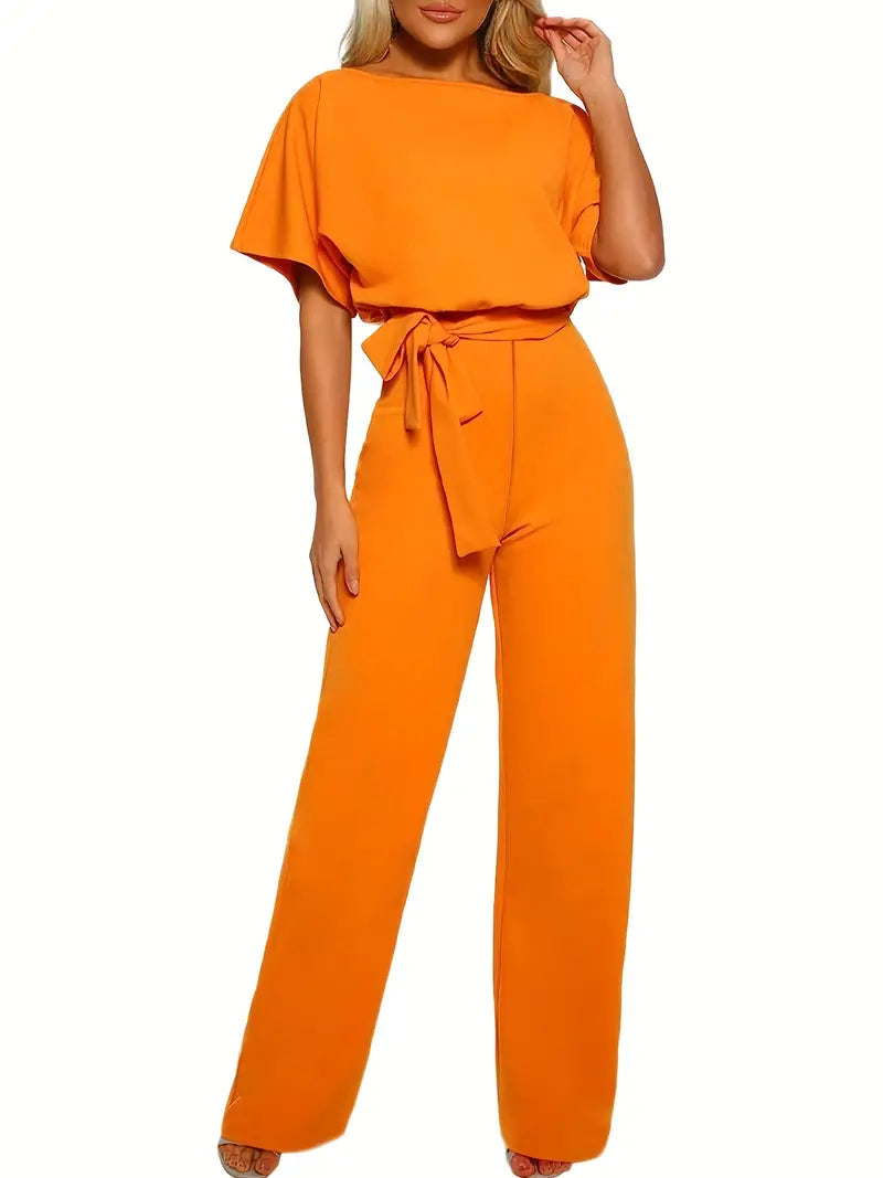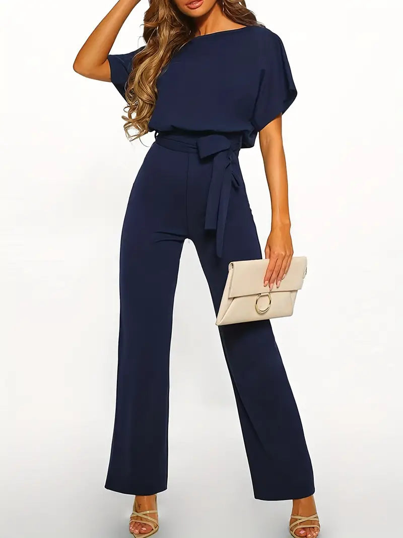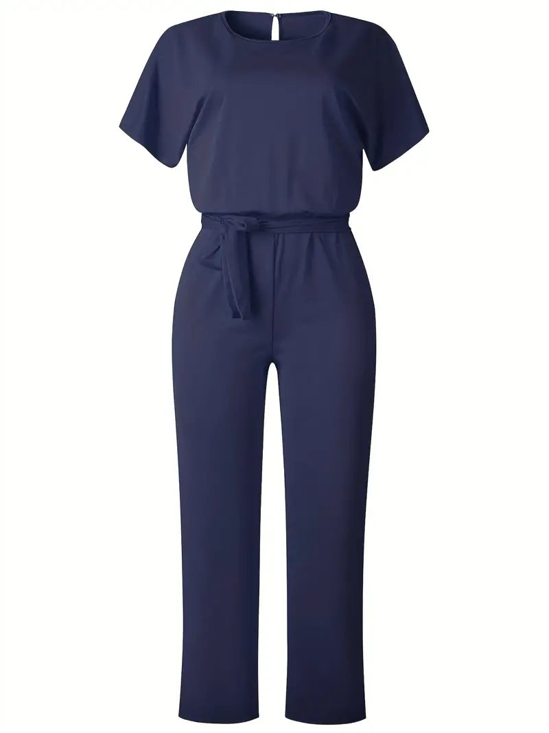 Macacão de perna reta com gravata na cintura, macacão casual de manga curta
