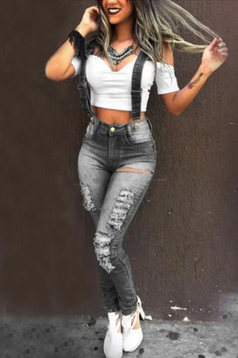 Macacão jeans rasgado com costura casual da moda
