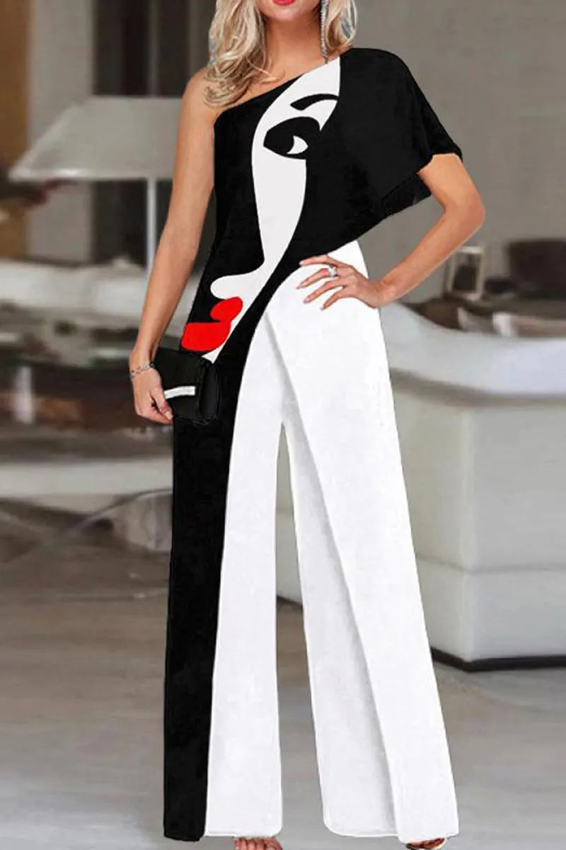 Macacões Retos Preto Branco Casual Estampa Patchwork Assimétrico Gola Oblíqua