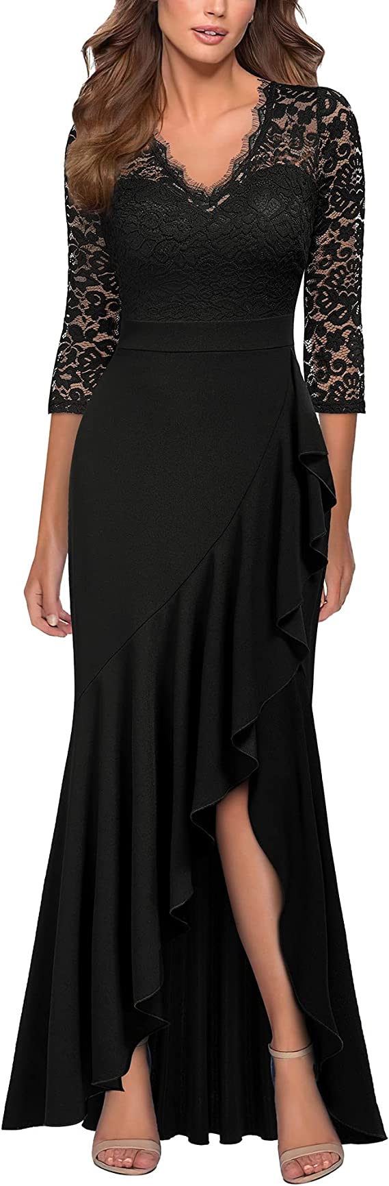 Vestido comprido elegante com strass e folhos, estilo sereia, para cocktail