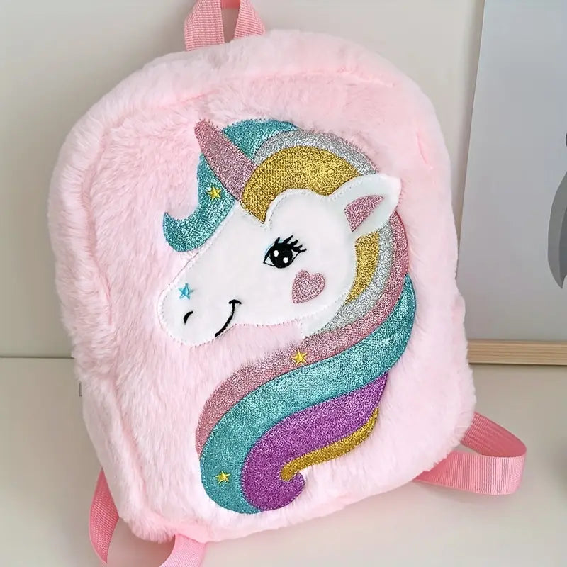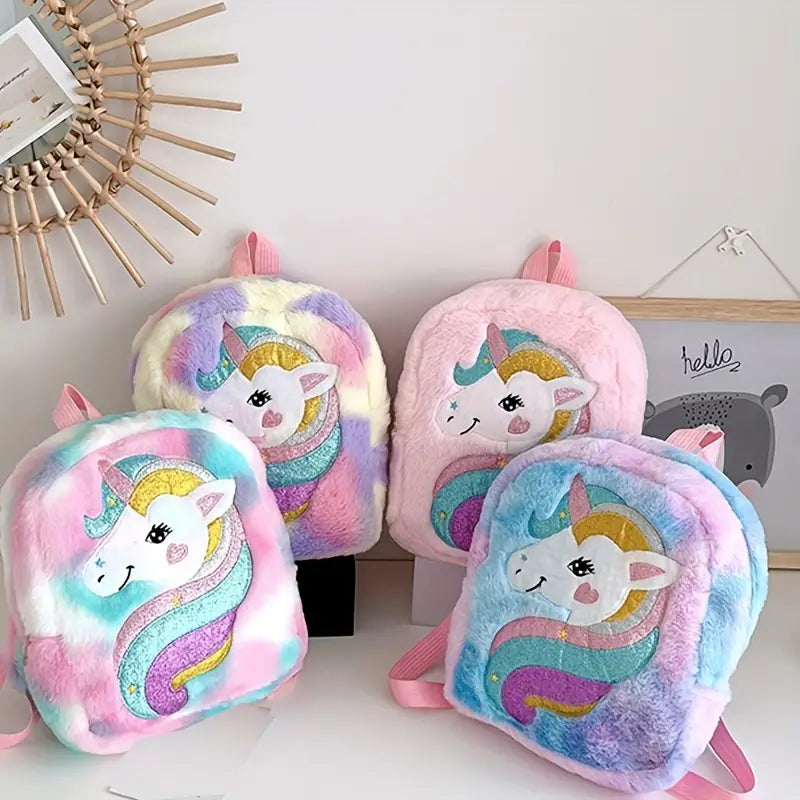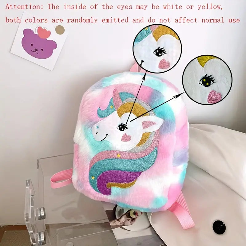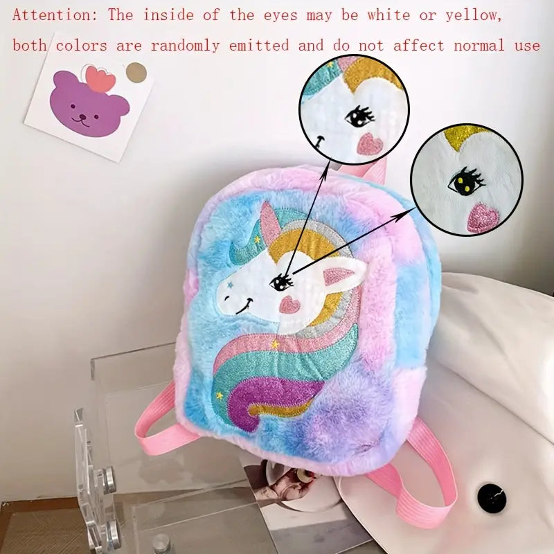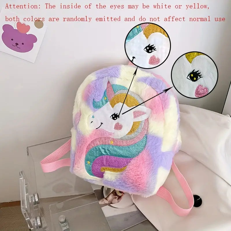 Mochila de unicórnio de pelúcia fofa, bolsa escolar de cor arco-íris