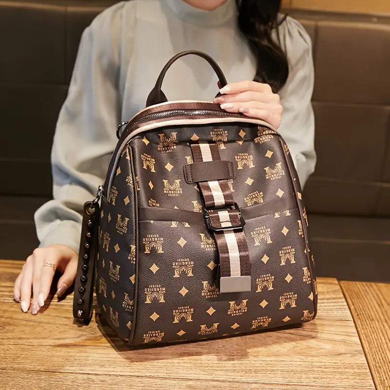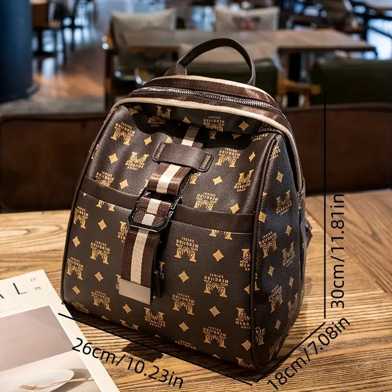 Mochila retrô com padrão geométrico, mochila com zíper de couro PU, mochila perfeita para viagens de lazer e uso diário