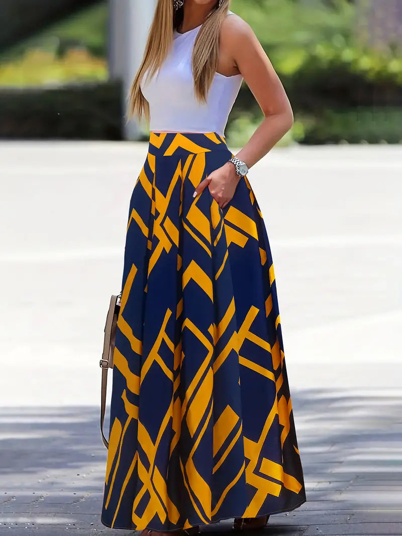 Saia de cintura alta com estampa geométrica, saia maxi casual com babados e bainha grande