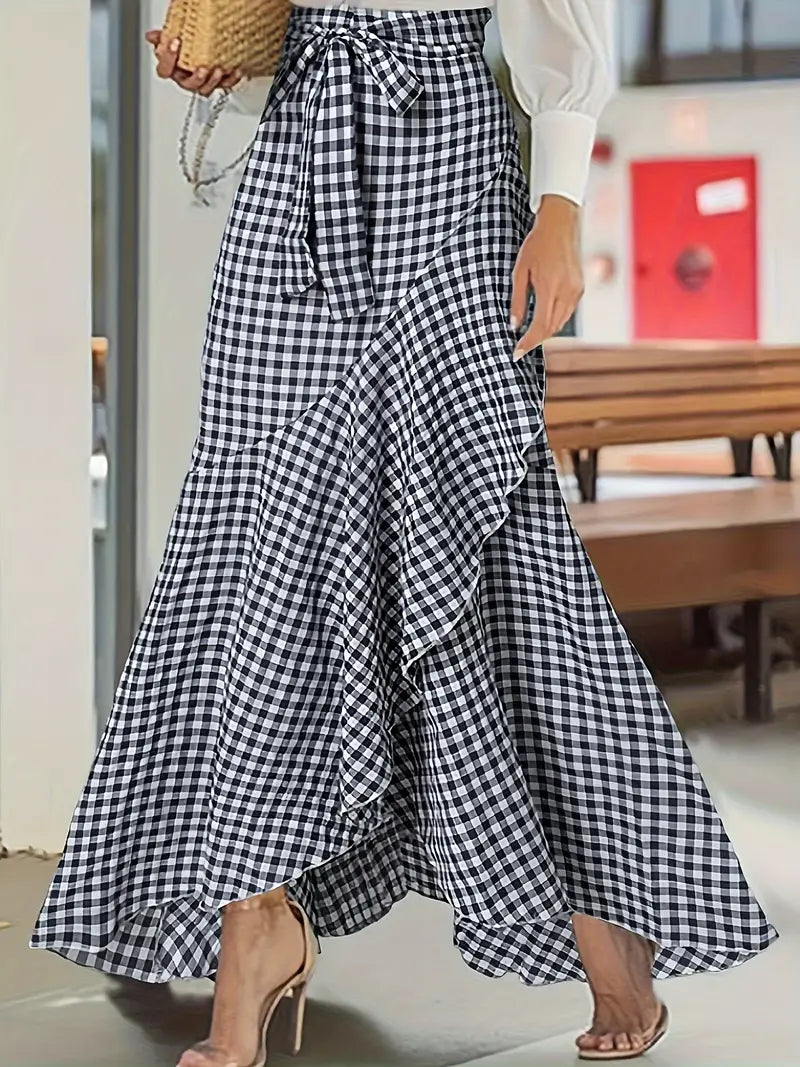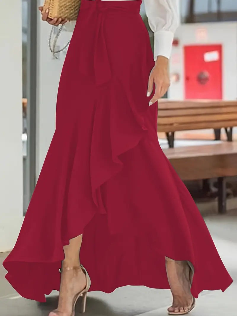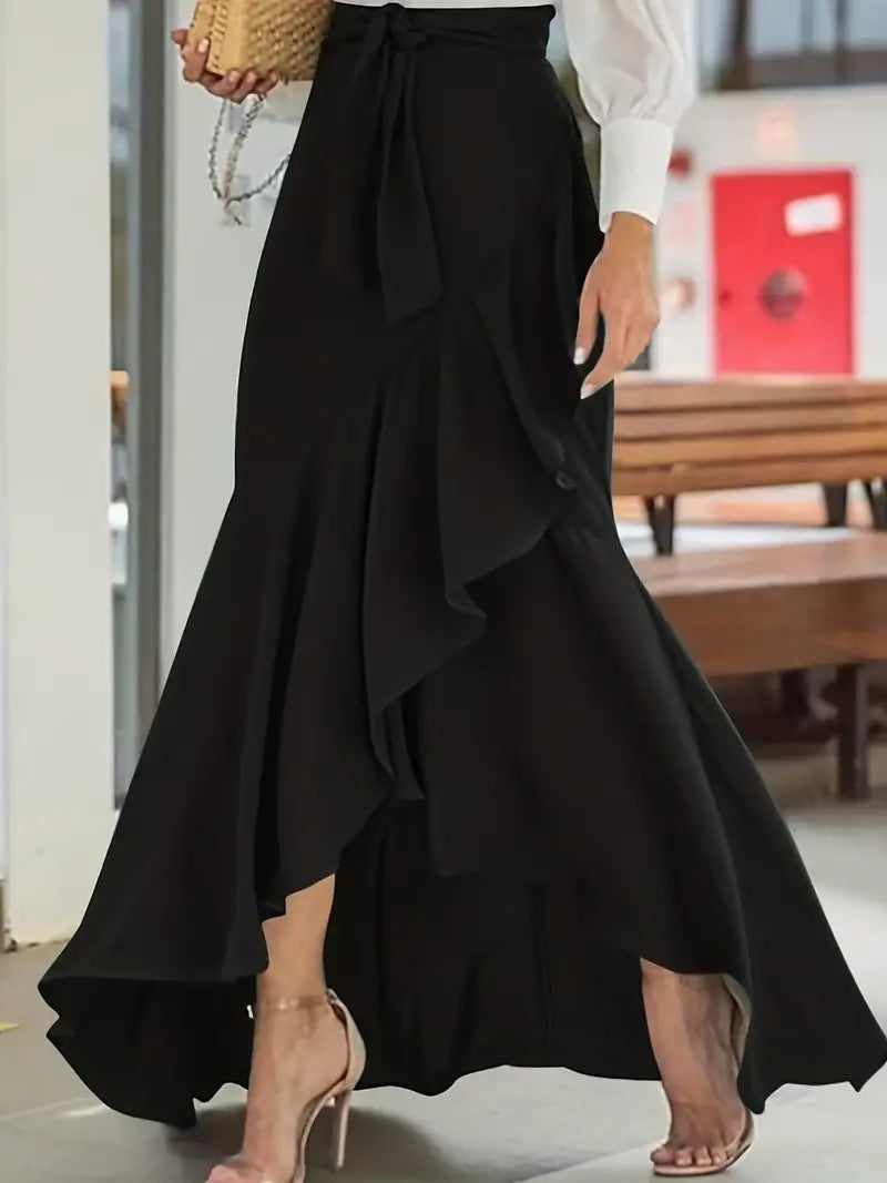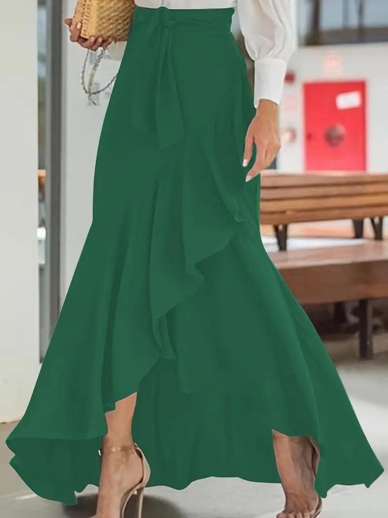 Saia em cascata de cintura sólida amarrada, saia casual com bainha com babados e comprimento maxi