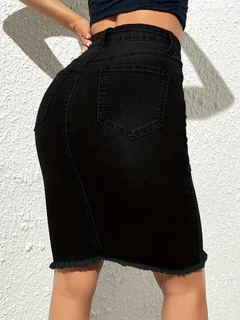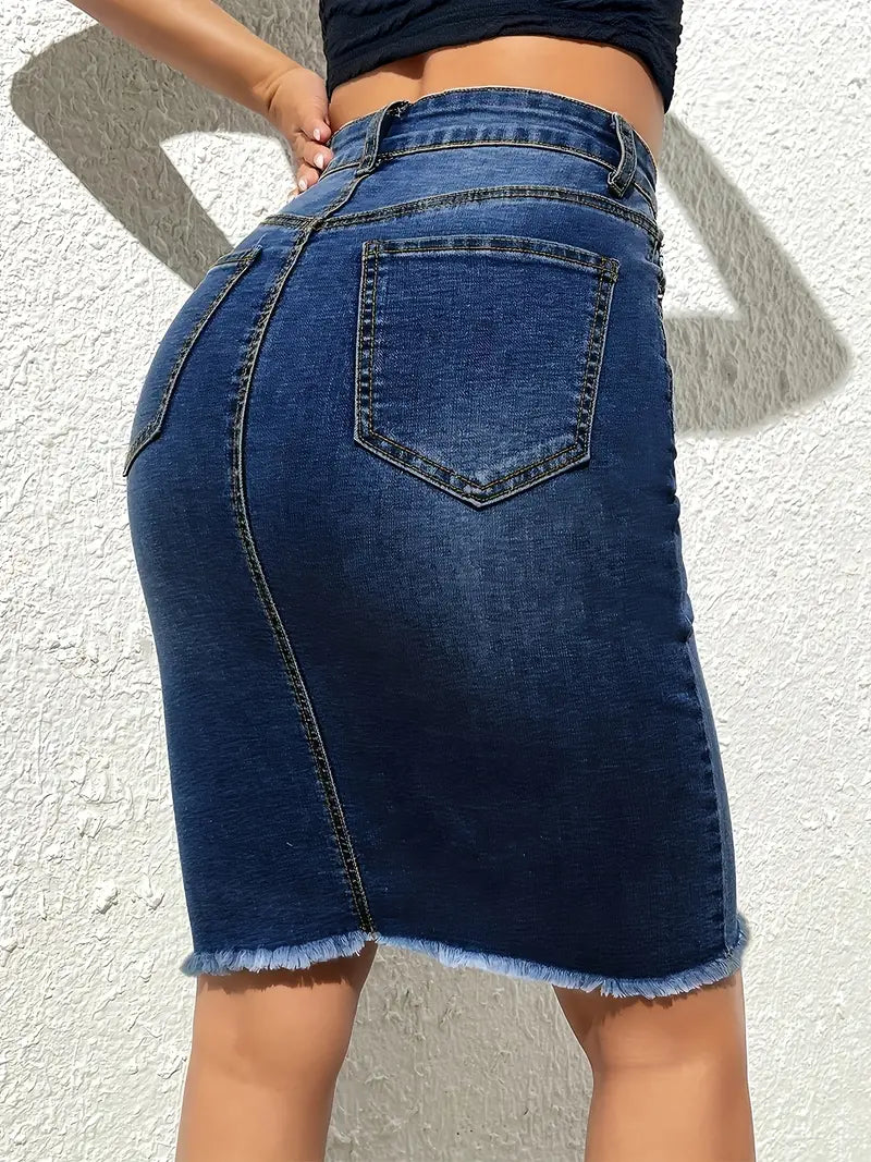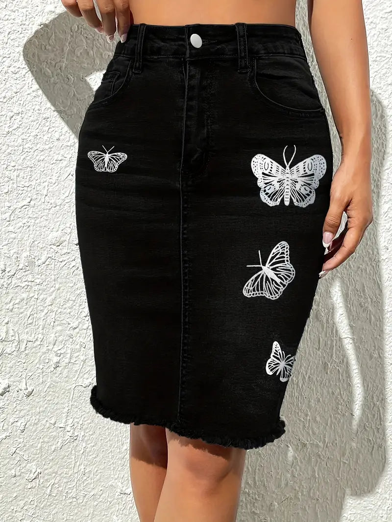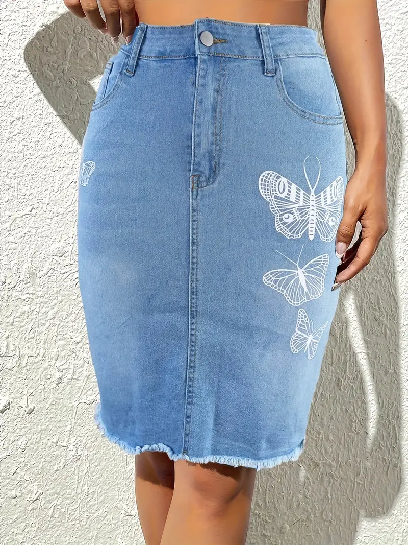 Saia jeans com estampa de borboleta lisa, saia jeans slim fit