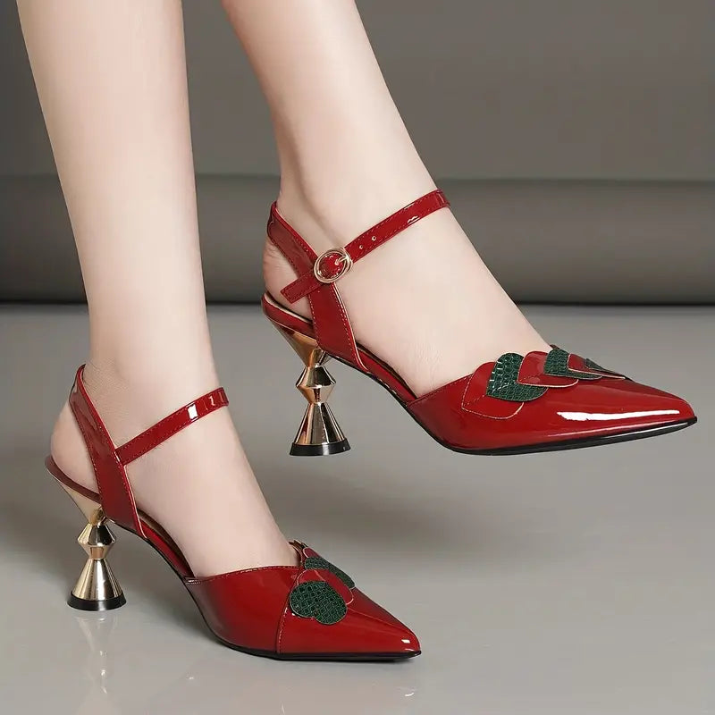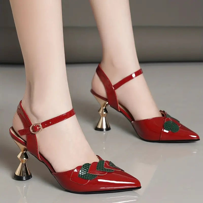 Salto alto de couro envernizado feminino, dedo do pé pontiagudo com tira no tornozelo